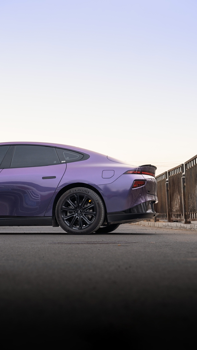 小鹏P7的完美线条 拍汽车呢一定要用广角拍摄,把车身流利的线条都拍出来 让整体更具有视觉感! 这台p7改了一个车身颜色威尼斯紫 让整车更“炸眼”了一些!
