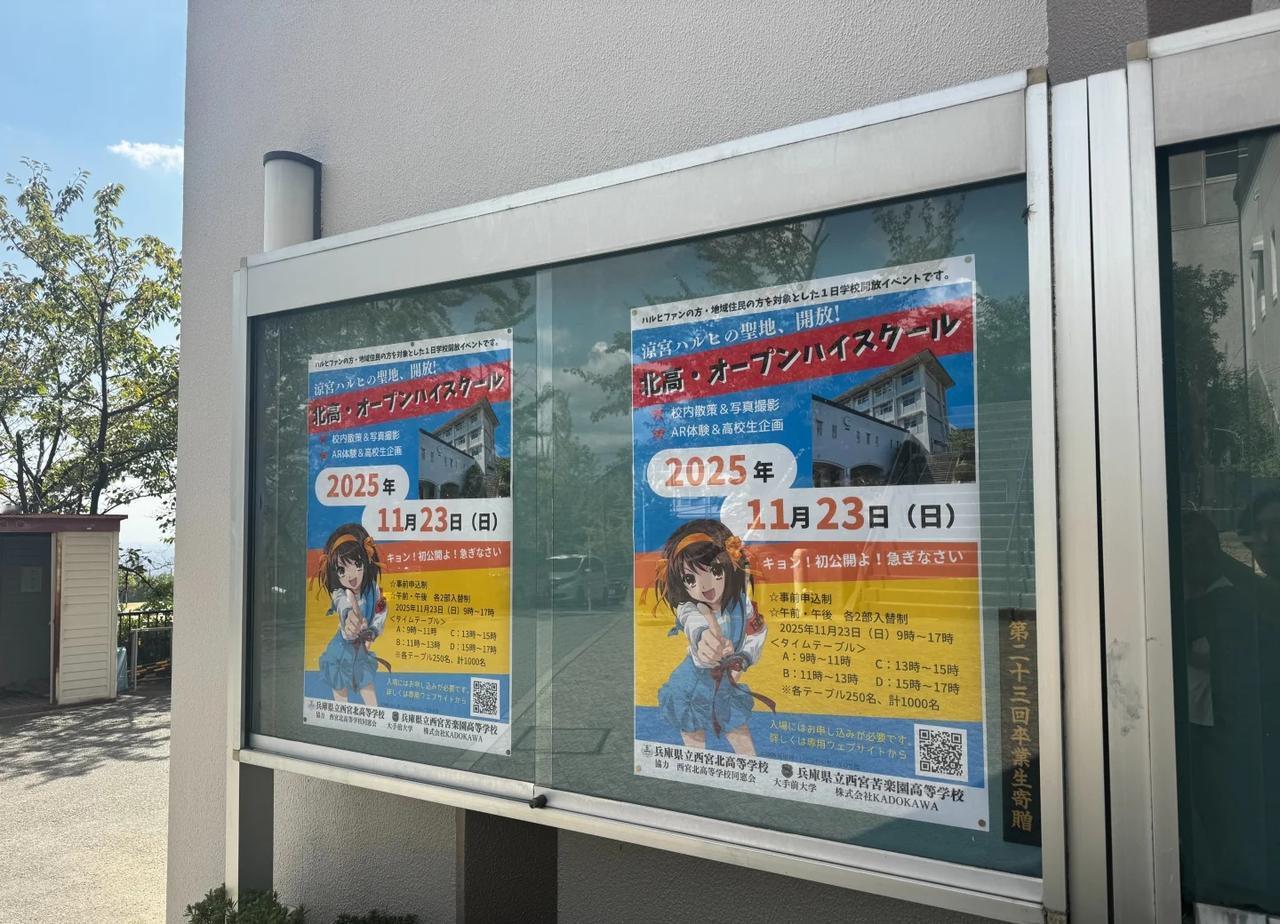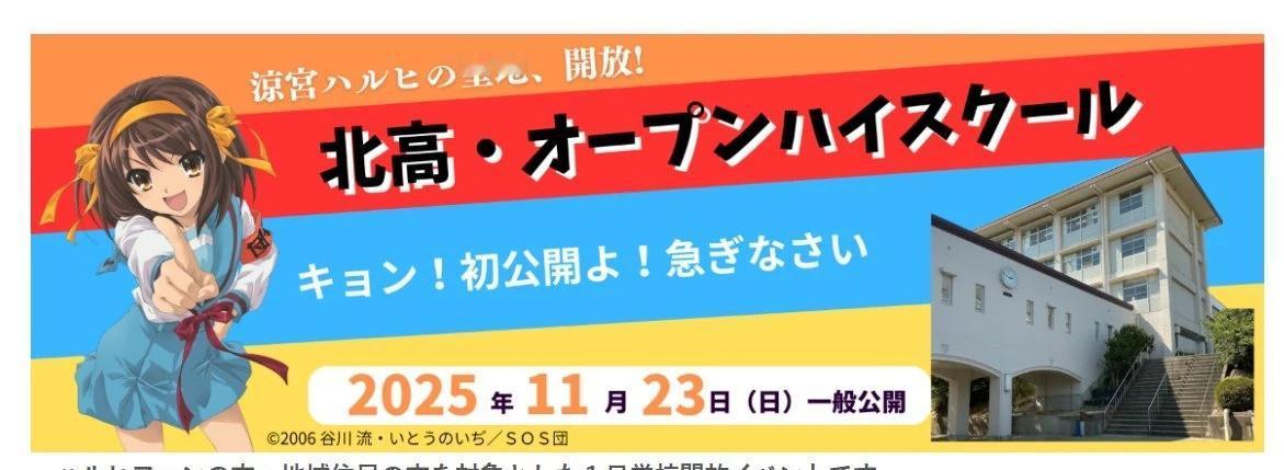 『凉宫春日的忧郁』圣地2027年3月底消失 受少子化影响、『凉宫春日的忧郁』舞台原型、巡礼圣地的谷川流母校西宫北高中与附近的高中合并、校名将在2027年3月底正式消失,为此,该校决定11月23日首次向粉丝开放校园一天,今年10月开放1000个名额申请后,当日下午便全部报满 23日当天将由学生带领参观动画中出现的场景,并让来访者体验由学生制作的AR,在校园特定地点用手机扫描即可在画面中看到被叠加显示的动画场景、学校希望通过此活动,让更多人记住西宫北高。凉宫春日
