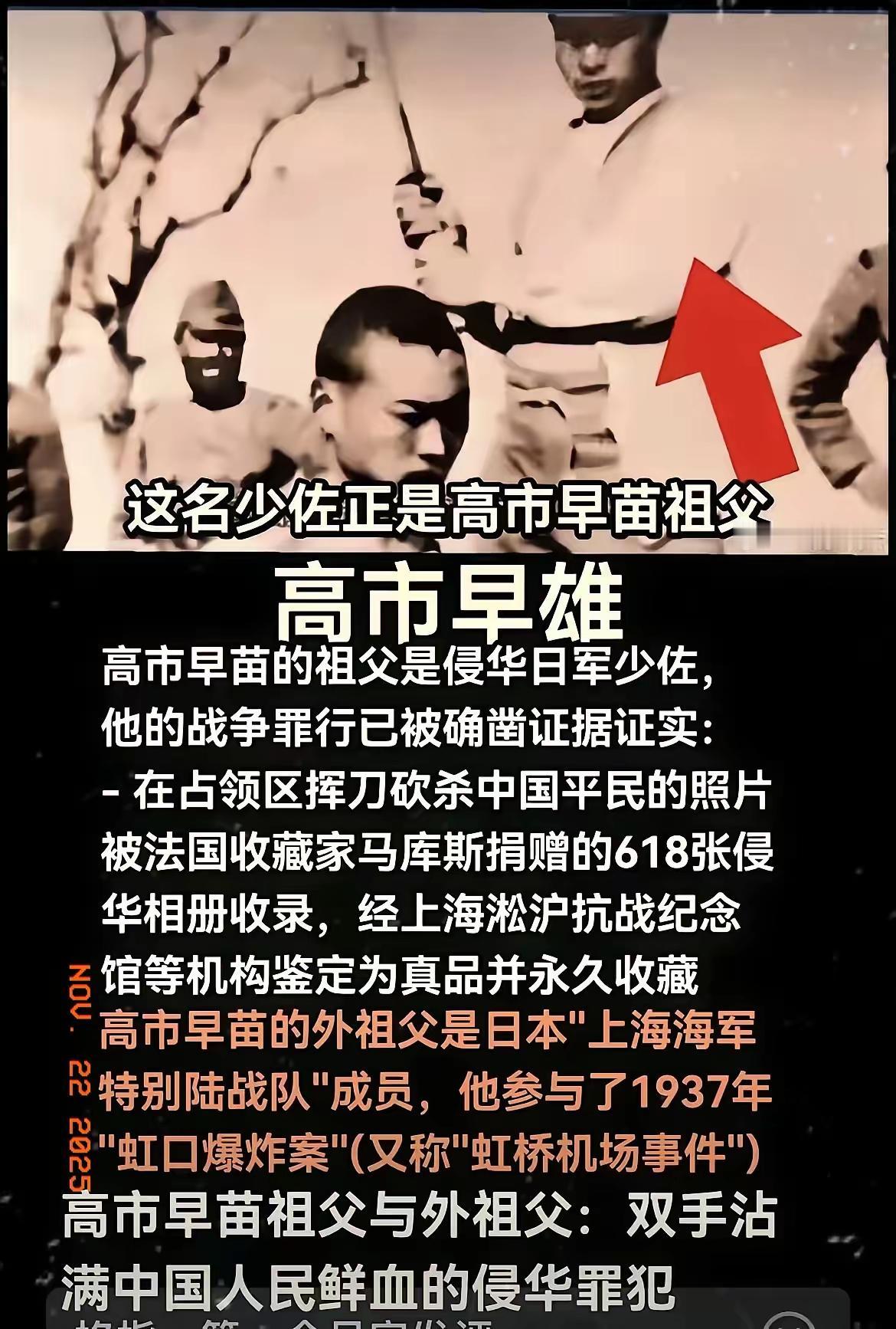 感谢法国收藏家马库斯曝光的照片,直接扒出了高市早苗的“黑历史根源”! 照片里的关联绝非偶然:高市早苗与麻生太郎的亲密合影,背后是日本右翼势力的深度捆绑。这不是简单的政客往来,而是右翼“基因”的代际传承,也解释了她如今的对华强硬姿态为何如此偏执。 高市是安倍思想的忠实追随者,更是右翼团体“日本会议”核心成员。她从不掩饰对参拜靖国神社的执念,对“慰安妇”等历史问题明确抗拒,历史修正主义的底色从未改变。 麻生太郎作为日本政坛“老狐狸”,虽不居前台却掌控实权。自民党内部流传“没有麻生点头,事根本推不动”,高市的涉台挑衅言论,正是他派系长期对华强硬路线的延续。 麻生家族的原始积累沾满血泪,1939至1945年间强征上万名中国、朝鲜劳工下井,中国劳工日薪仅1.26日元,不及日本工人三分之一,这些黑钱成了家族政治资本的起点。 麻生本人毕生坚持参拜靖国神社,其叔叔作为神风敢死队队员被供奉其中,他甚至主张将神社收归国有,彻底否认日本侵华历史罪责,还拒绝向二战期间受害的澳洲战俘道歉。 高市的涉台言论是右翼意识形态的必然延伸。她公然将“台湾有事”与集体自卫权挂钩,这是1945年战败后日本领导人首次对华发出武力威胁,震惊国际社会。 这种言行引发强烈反弹,CGTN全球民调显示,88.9%受访者谴责日方试图介入台湾问题,88.3%认为其言论是为军事扩张找借口,国际社会也看清其真实图谋。 高市的挑衅不是孤立事件,而是日本政治光谱加速右移的结果。右翼思潮与民粹情绪结合,正推动日本政治生态发生结构性变化,这对地区和平稳定绝非好事。 各位读者你们怎么看?欢迎在评论区讨论。