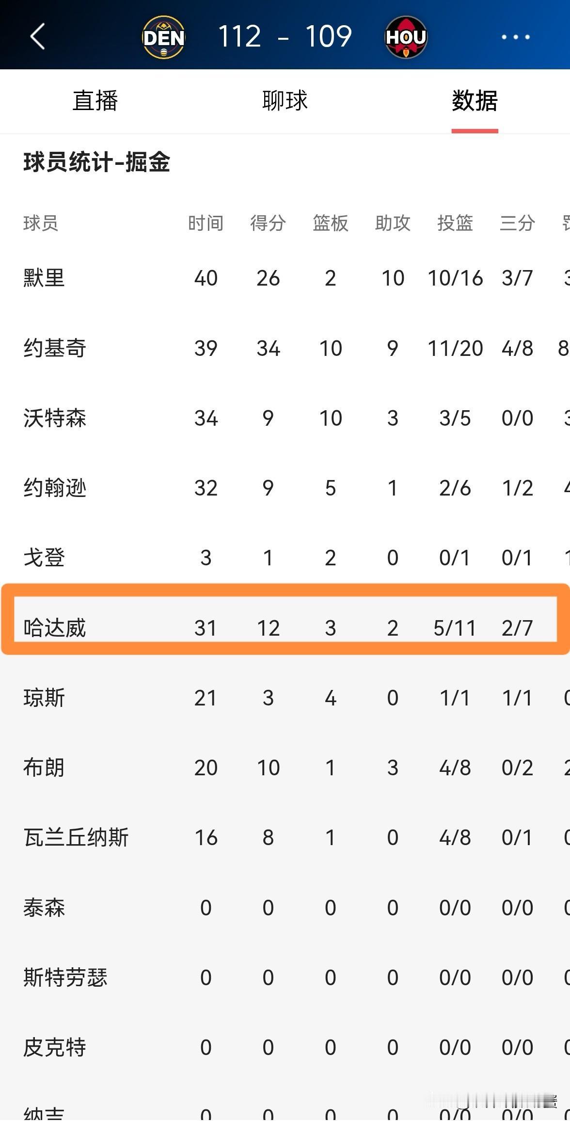 掘金大将小哈达威不愧是球队的替补神兵!在今天掘金客场以112:109险胜火箭的比赛中,小哈达威替补出战31分钟,投篮11中5,其中三分球7中2得到12分3篮板2助攻,没有出现任何的失误,他的场上正负值为+4。 本场比赛小哈达威在进攻端为球队提供了非常大的帮助,他是球队获胜的大功臣。