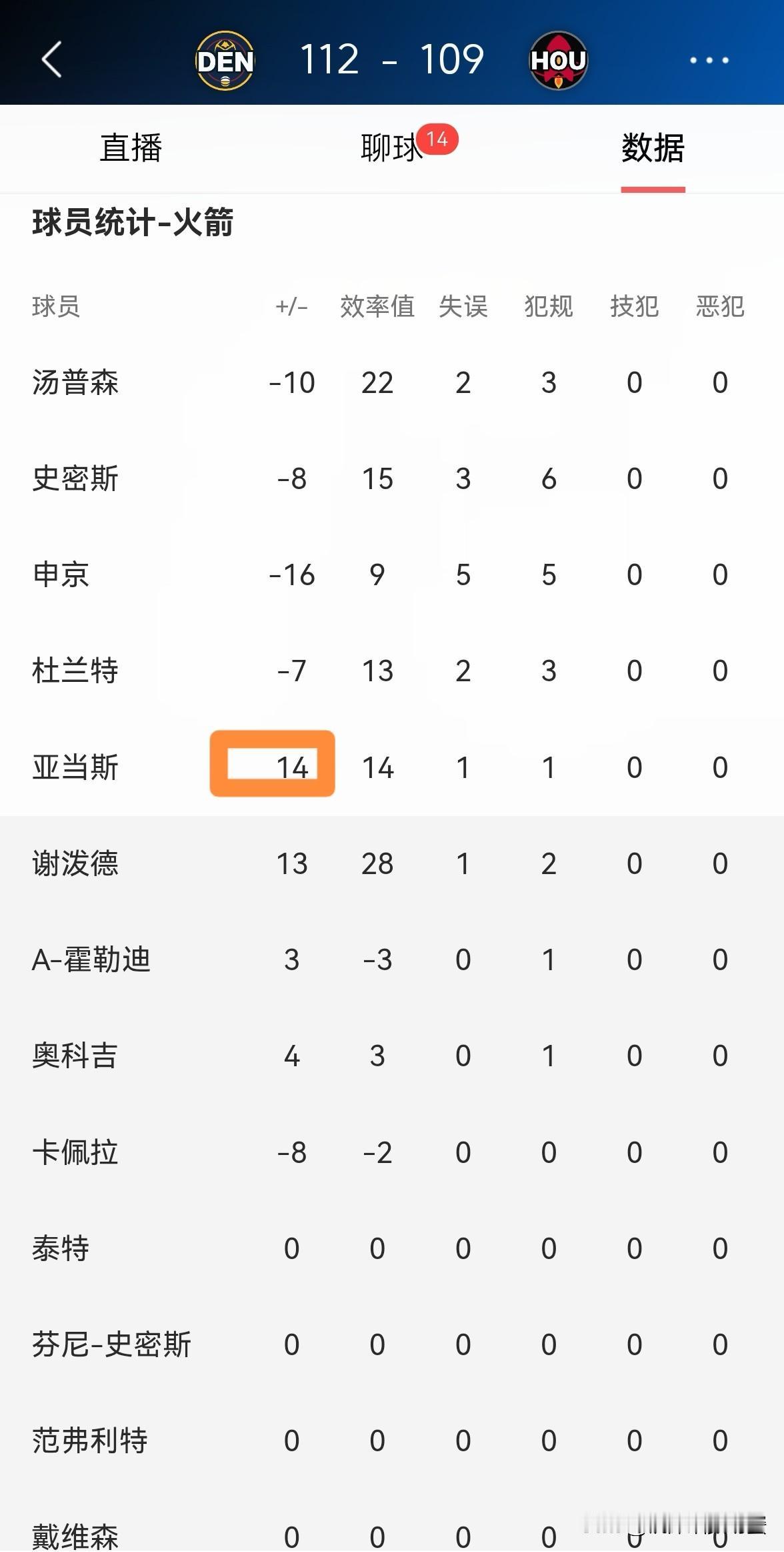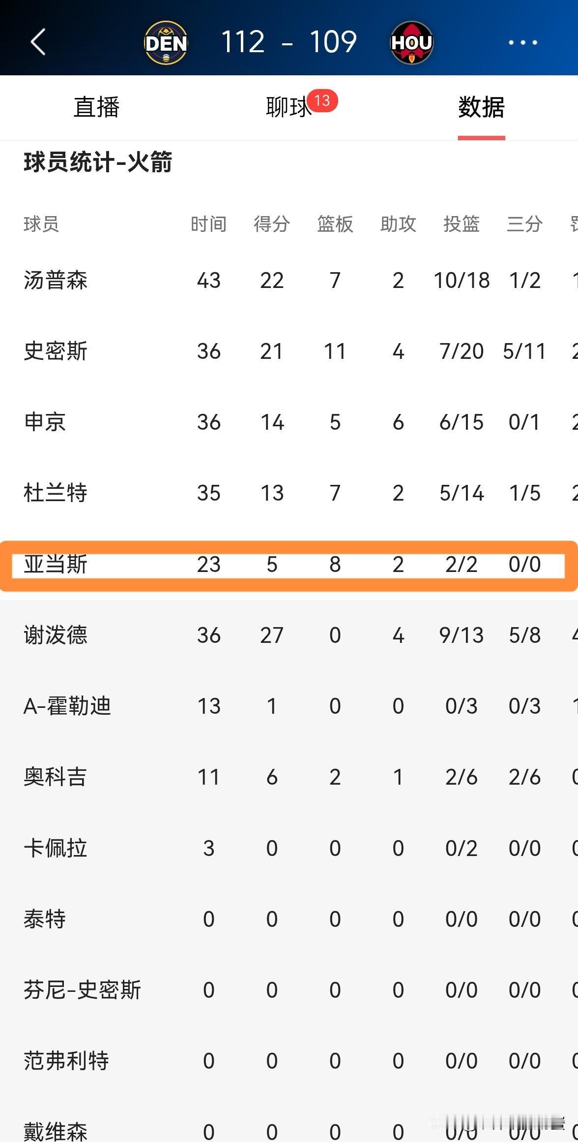 火箭老将亚当斯真是太委屈了!尽管今天火箭在主场以109:112惜败于掘金,但是亚当斯依然打出了非常出色的表现。全场比赛下来,亚当斯首发出战23分钟,投篮2中2,其中罚球3中1得到5分8篮板2助攻,他的场上正负值为+14。坦白说,自从新赛季开赛以来,亚当斯的表现一直非常稳健高效,可是他的场均上场时间却不足30分钟,我觉得亚当斯在火箭待着真是太委屈了。