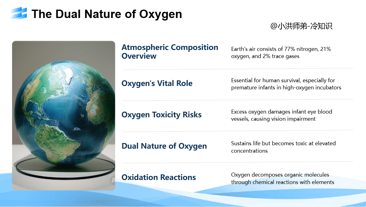 为什么大气中的氧气不能过多?地球上的大气是由很多种气体共同组成的混合物,含量最高的是氮气——大约占空气总量的77%;其次是氧气,占21%;其余的2%主要由痕量气体组成,包括氩气、二氧化碳、氦气、氖气、氪气、氙气、一氧化二氮和一氧化碳等。此外,空气里还含有不定含量的水蒸气。人类离不开氧气,因为氧气维持了机体的运转。早产的婴儿通常会被放入氧气含量比较高的育婴箱,因为他们的肺还没有发育完全,呼吸功能不完善。育婴箱里的氧气含量通常是30%~40%,这比空气中21%含量要高出很多。对于出现严重呼吸障碍的婴儿,为防止脑供氧不足,有时还需要为他们戴上氧气罩,让他们呼吸100%的氧气。但是氧气过多同样对人体有害。育婴箱里氧气含量过高会使婴儿血液中氧含量升高,而过高的血氧含量会损伤婴儿眼球里的血管,从而导致视力下降或丧失。这说明了氧气的两面性。一方面,人类依靠氧气才能生存;另一方面,氧气也会成为危害生命和健康的毒药。当空气中的氧气与其他元素(像氢、碳)混合在一起时,通常会发生化学反应,叫作氧化反应。在氧化反应中,通常一些构成生命的最基本的有机分子会被分解。|||