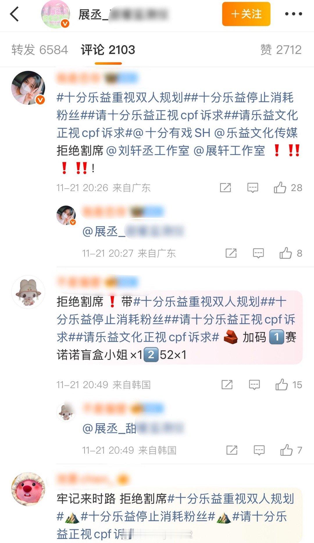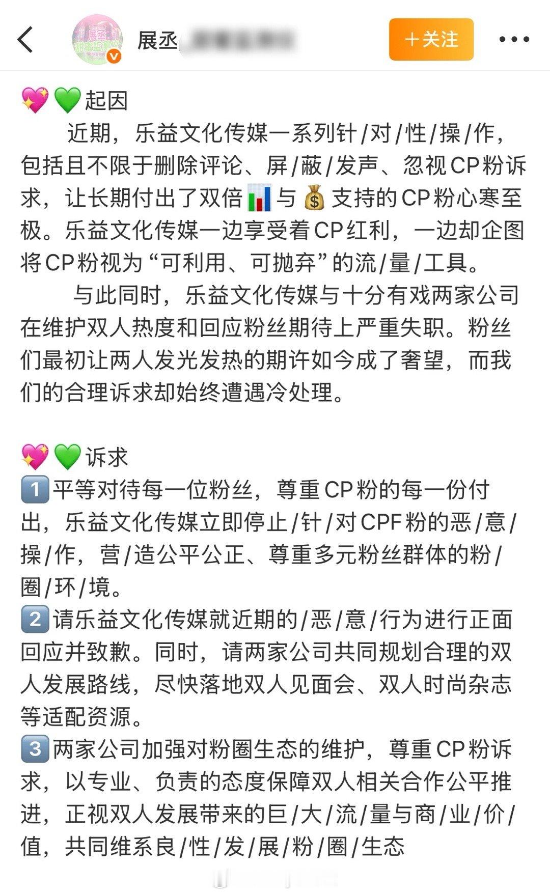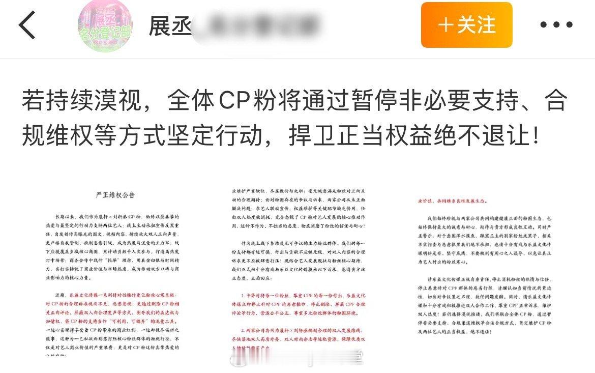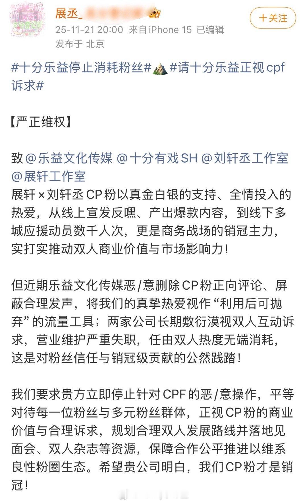 展轩、刘轩丞一直没有双人营业引发展丞CP粉不满,现在粉丝发声明要求平等对待每一位粉丝,尊重CP粉的每一份付出,更强调两位不要忘了来时路……
