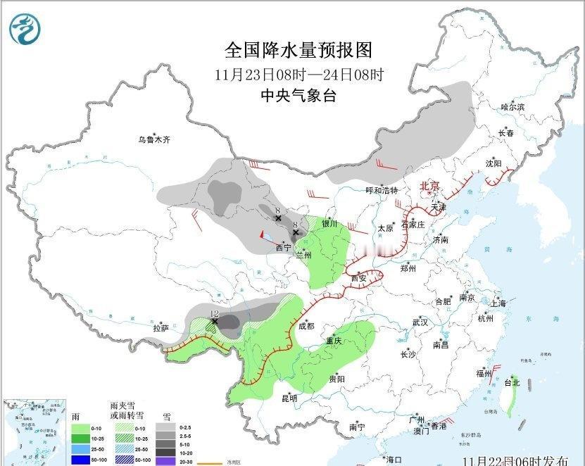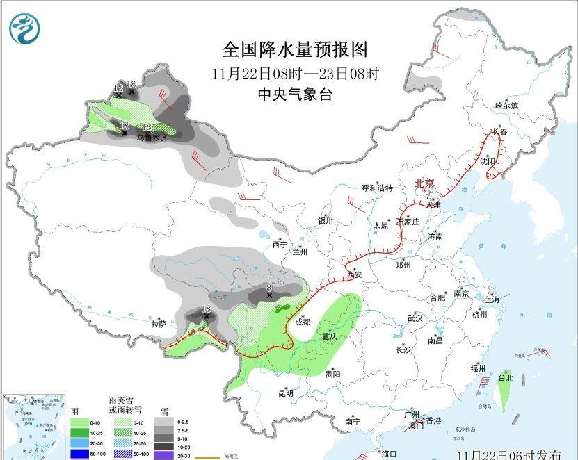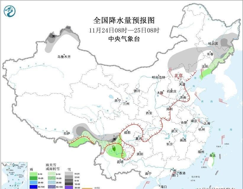 全国天气【新一股冷空气将影响我国大部地区】11月22日至25日,一股较强冷空气将自西向东影响我国大部地区,将带来北方6~8℃、南方4~6℃降温,北方局地降温可达10~12℃,并伴有4~6级偏北风,局地阵风8~9级。新疆北部、西北地区、华北北部及东北地区等地有小到中雪,其中,新疆北部的部分地区有大雪,局地暴雪。26日前后,又有一股冷空气自北向南影响我国中东部,我国大部地区将有4~6℃降温,部分地区降温8~10℃。西北地区、华北北部及东北地区有小到中雪或雨夹雪。小雪