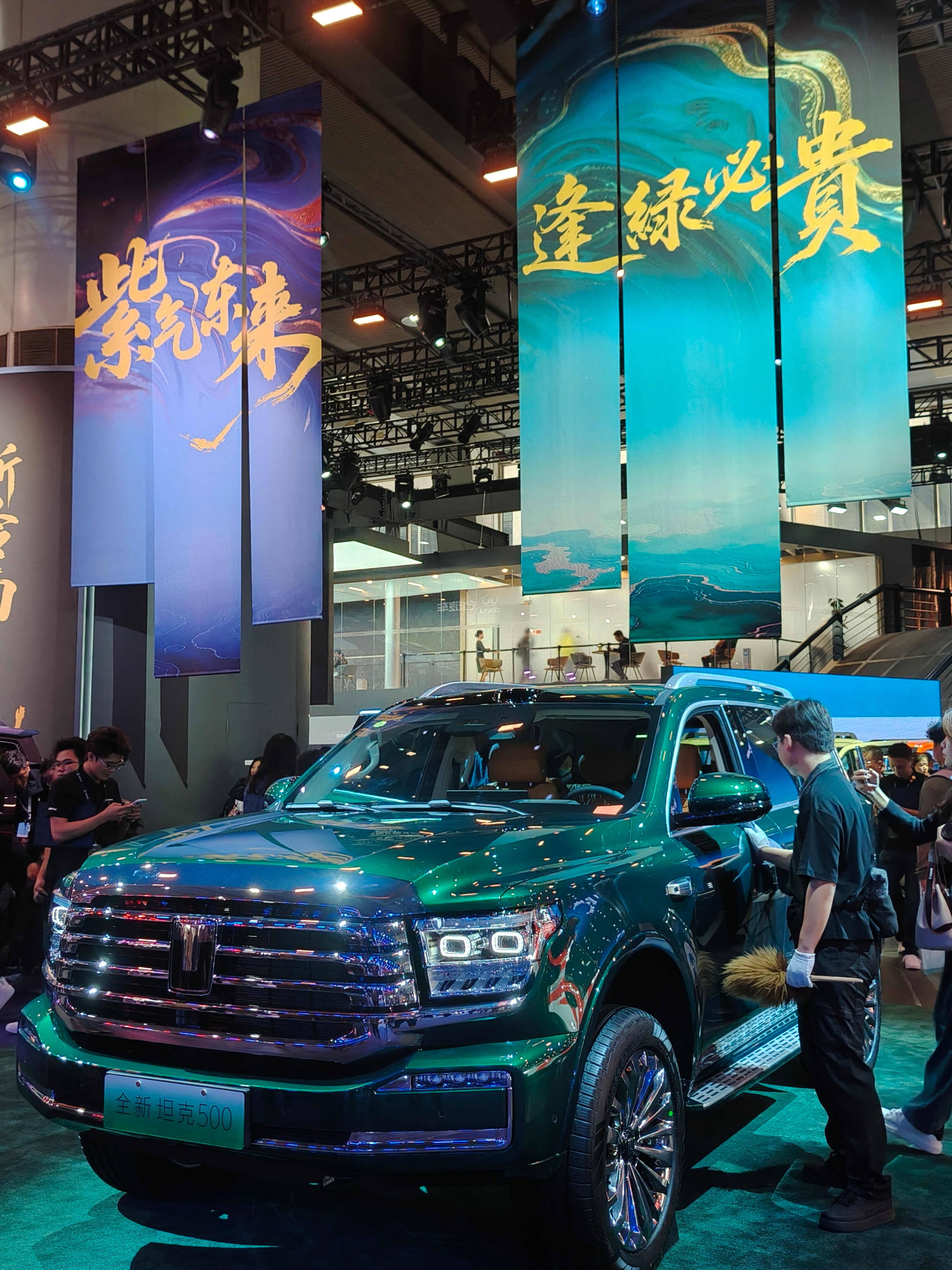 坦克展台的 C 位给到全新坦克400和坦克500,紫气东来的敦煌紫和逢绿必贵的敦煌绿吸引了不少目光,它们把传统文化寓意玩成了新的潮流符号。不得不说,在新能源当道的今天,坦克这种深耕硬派越野的反向操作反而显得格外有态度。