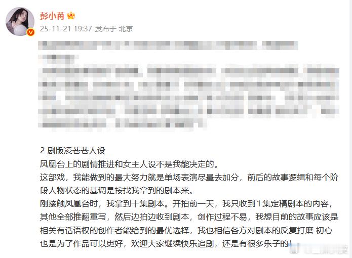 彭小苒《凤凰台上》开拍前只收到1集剧本,后面边拍边收到剧本🚬 连女主角都拿不到全集剧本,们内娱