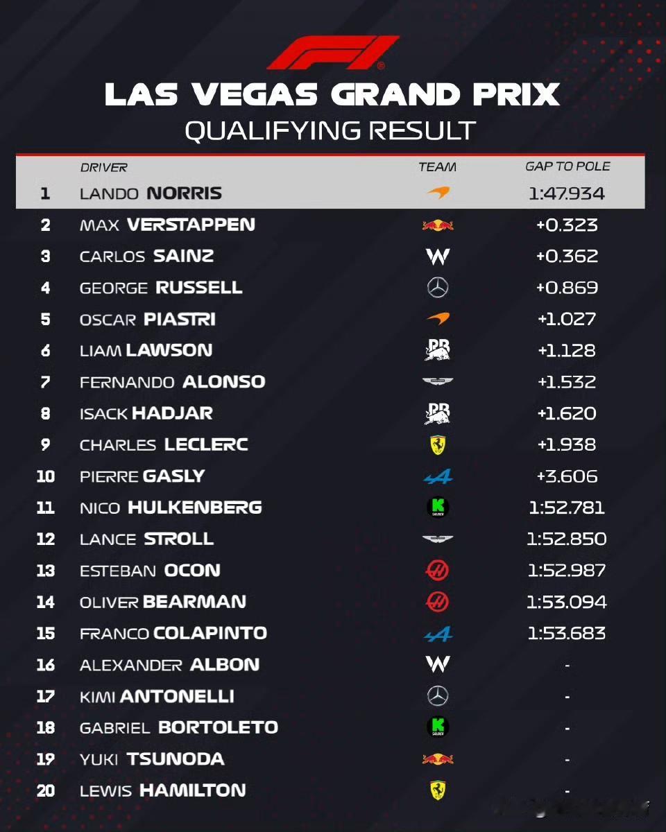 赛车:2025F1拉斯维加斯大奖赛排位赛诺里斯杆位! 拉斯维加斯湿地排位大战,兰多宣言式夺杆! 排位前十⬇️ 1️⃣诺里斯 2️⃣维斯塔潘 3️⃣塞恩斯 4️⃣拉塞尔 5️⃣皮亚斯特里 6️⃣劳森 7️⃣阿隆索 8️⃣哈贾尔 9️⃣勒克莱尔 🔟加斯利
