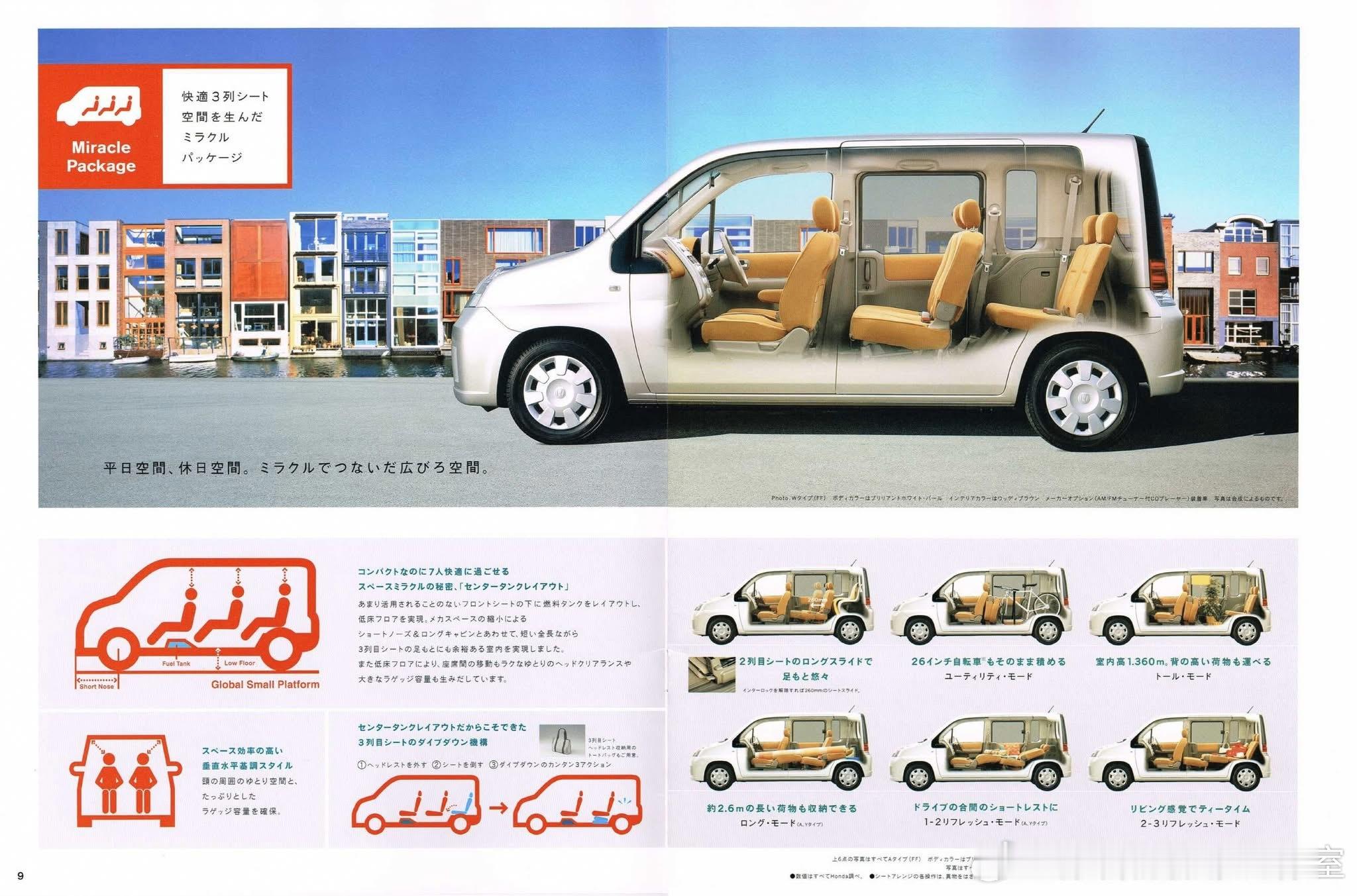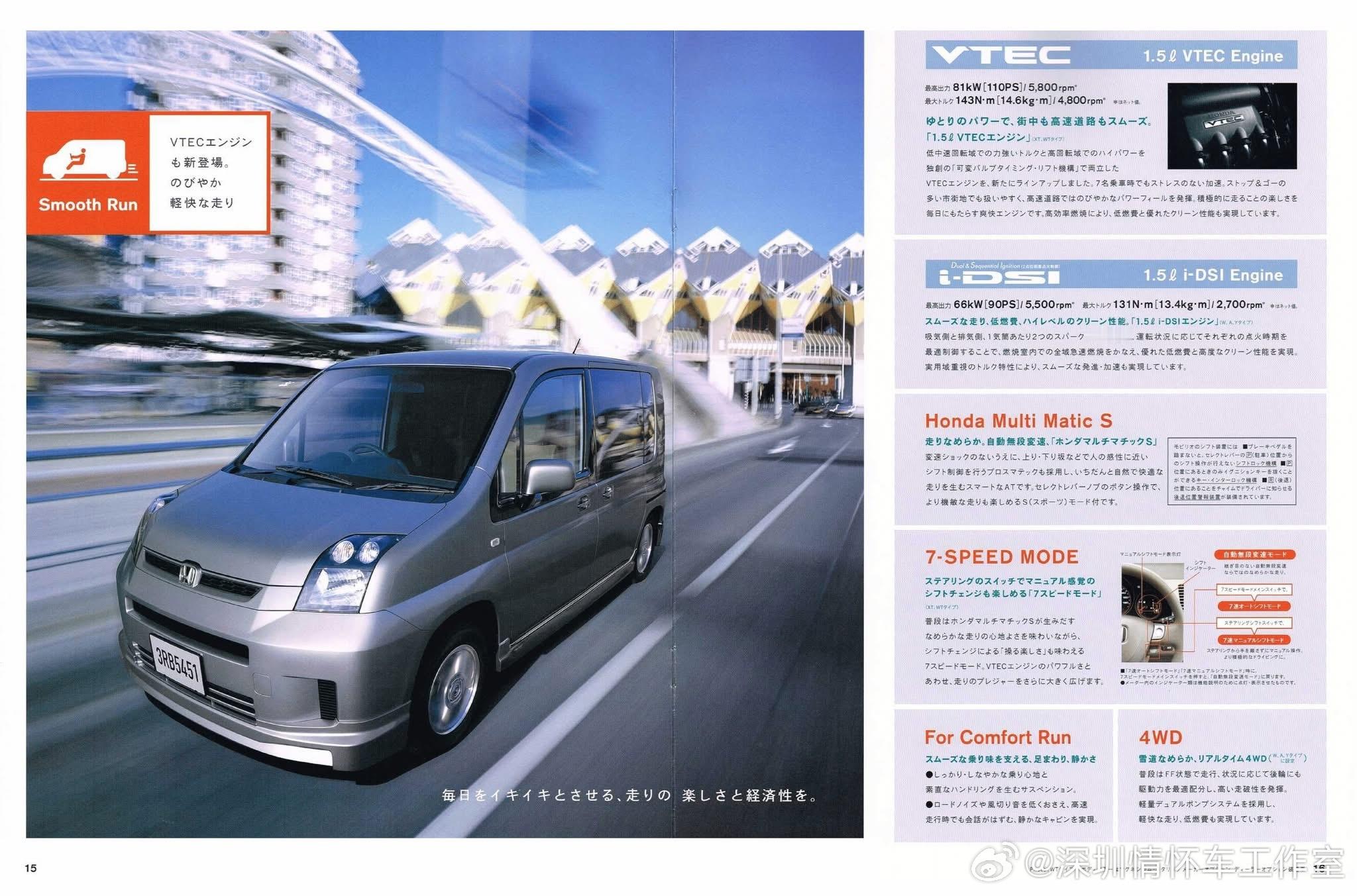 2004本田Mobilio一款有JDM风格很有趣的MPV,Mobilio是面向日本市场的7座紧凑型MPV,主打4米级车身+7座布局的紧凑MPV,适配家庭休闲场景。2002年本田还推出衍生款Mobilio Spike,车身长度不足4米却能实现灵活的座椅布局,匹配CVT变速箱,提供前驱和全时四驱版本,还保留Y、A、W三个配置等级,满足不同消费需求。