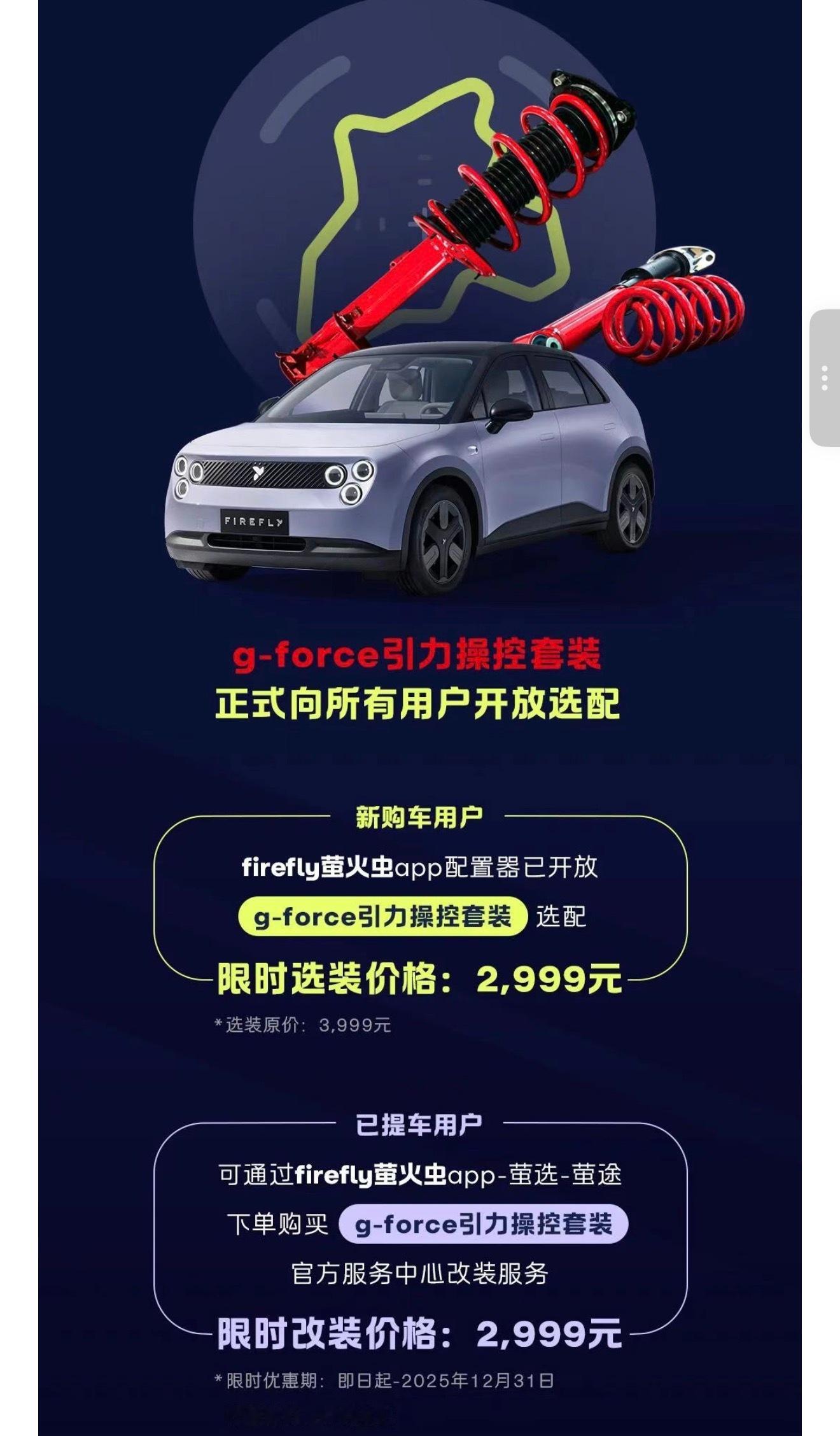 萤火虫最近频繁上新,上新了减振器升级,一切为了操控。新老车主都是2999元,我建议年轻用户升就对了。萤火虫不改,不如推下海。