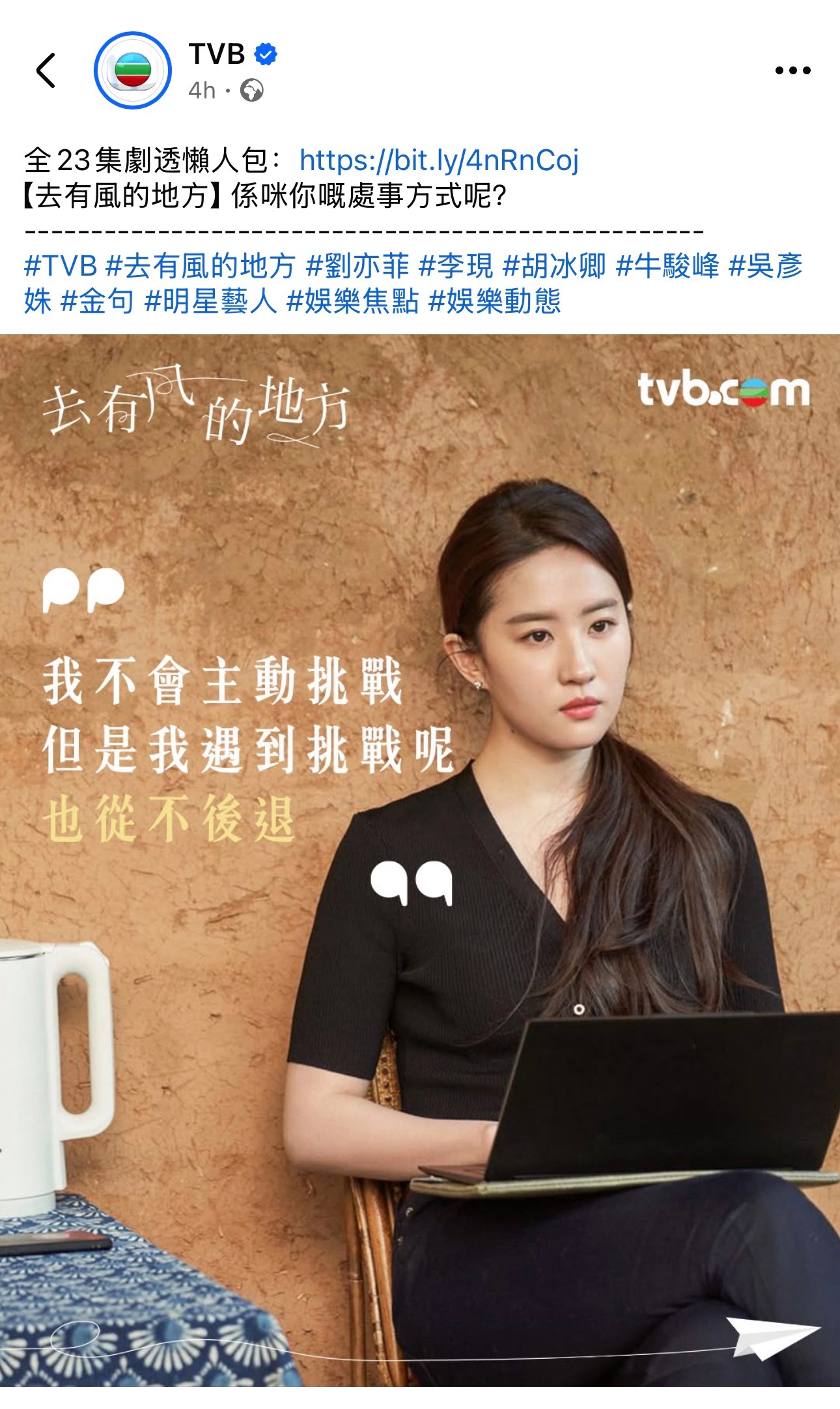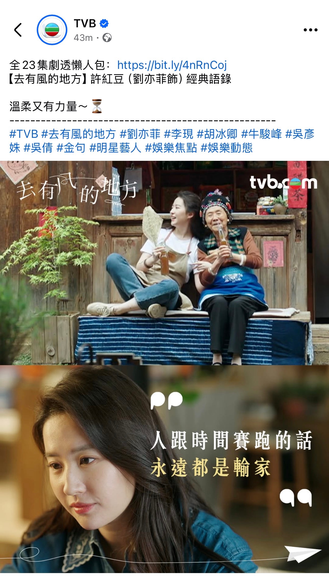 lyf 刘亦菲那部剧《去有风的地方》正在TVB热播,TVB官方Ins和FB也一直在盘点我们许红豆的精彩场景和金句台词,刘亦菲细腻精湛的演技和无可比拟的影响力取得口碑热度双丰收