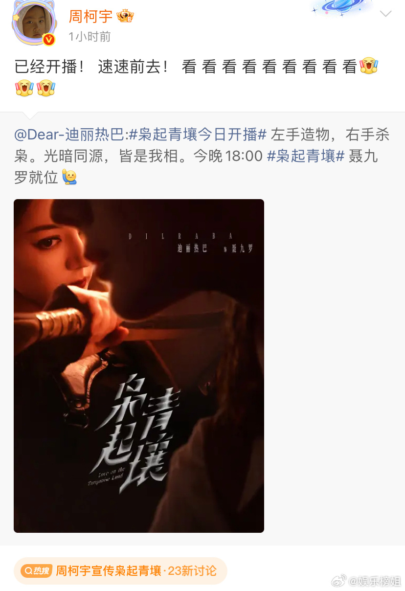 周柯宇宣传迪丽热巴《枭起青壤》!"已经开播! 速速前去! 看 看 看 看 看 看 看 看 看" 在看了,在看了,很好看👀巴姐演技超好的都来看