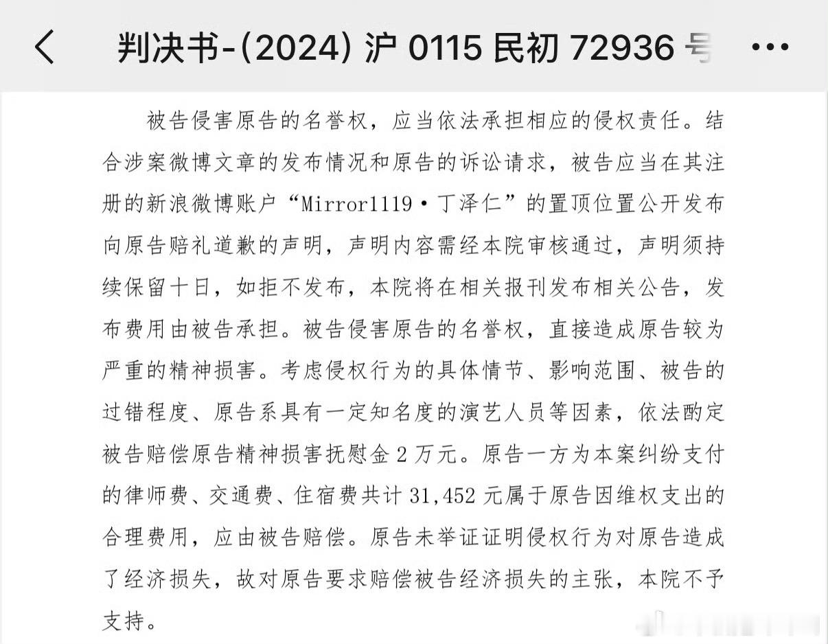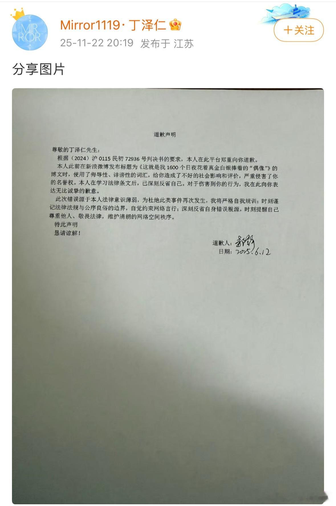 唯一的姐回复丁泽仁了图二原文:“因此,涉案微博文章中的在恋爱期间出轨其他女性、私生活混乱、隐瞒已有女友的身份、在酒店发生性行为、上门服务滥交之人等事实表述内容具有基本的事实依据,被告没有通过捏造事实、歪曲事实等方式诽谤原告……”图九是道歉声明