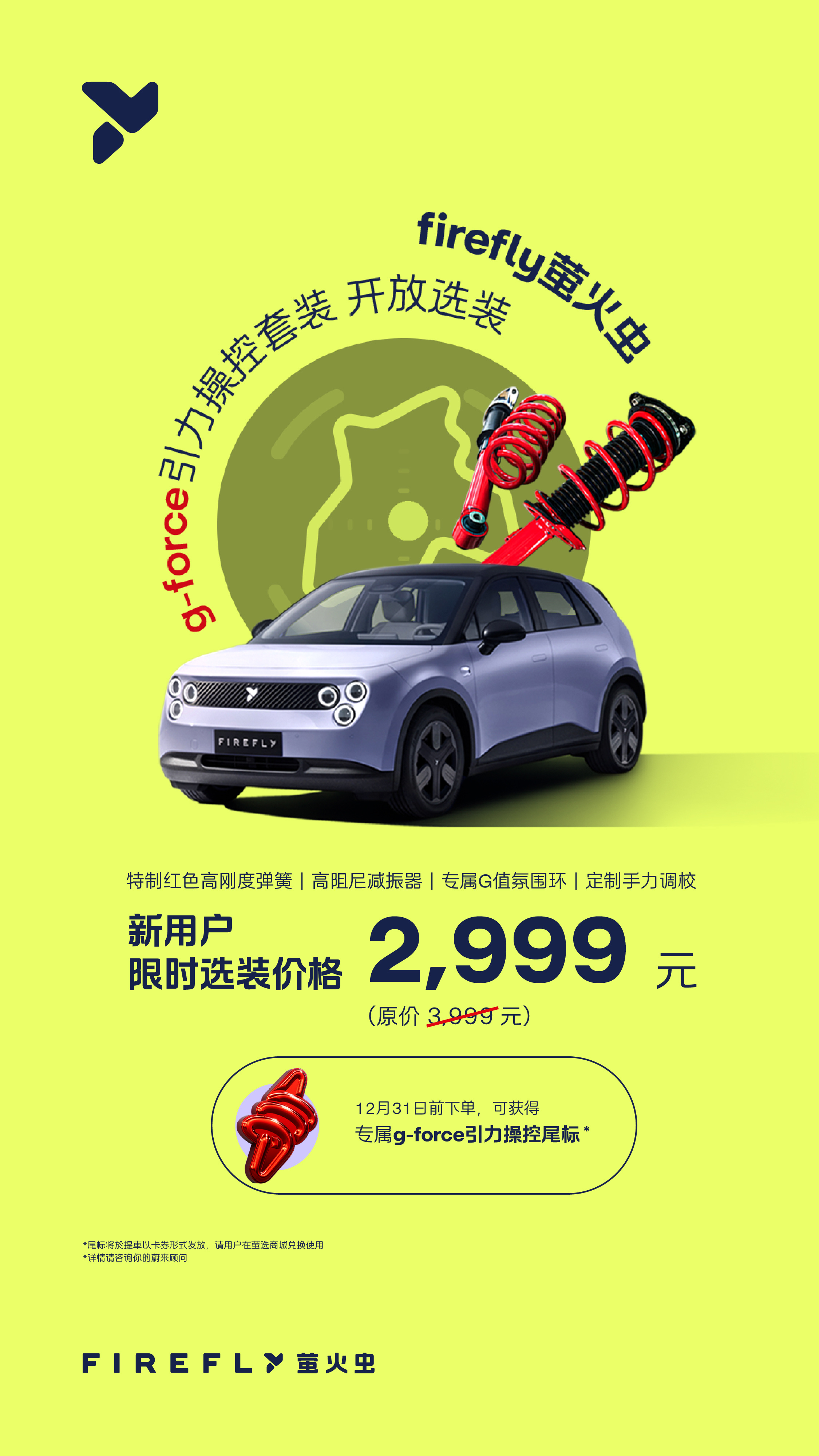 萤火虫是会玩的,最近趁着广州车展提出了一个新的概念叫做:【心流操控哲学】第一次看到这个词的时候,我作为萤火虫的车主我懵逼了,这是啥 Z 时代的新语言吗?实际上【心流操控哲学】就是对于萤火虫驾驶感受的一个抽象化的概括。最近我开萤火虫出门的时候,对于萤火虫这台车的喜爱是呈现指数级的增长的,原因简单来说就是这台车太好开了!1️⃣首先好开体现在了灵活上:萤火虫本身就是以 “灵动精准” 为核心的,这台车拥有同级最小 4.7m 转弯半径,可以轻松应对城市穿梭、狭窄路况掉头;转向手力线性响应,低速轻盈、高速稳重,实现 “指哪打哪”。2️⃣其次是萤火虫的轻量化设计和澎湃的动力萤火虫搭载蔚来自研第四代电驱,配合 35700Nm/deg 高扭转刚度,这比很多大车的扭转刚度都要高了。不到 1.5 吨轻量化车身(比竞品轻 200-300kg),动力响应快;3️⃣最后就是小车具备独有的驾控体验萤火虫聚焦 “底盘稳韧 + 路感清晰”,实现 50:50 黄金配重与 65.3% 高轴长比;采用同级唯一前麦弗逊后五连杆悬架,全解耦控制兼顾稳与舒适;为了提高我们萤火虫车主的驾控体验,最近萤火虫还给大家打造出驾控更强的 g-force 引力操控套装。帅!这个 g-force 我在之前的萤火虫特别版本【夜行生物】上就已经看过了,战斗感满满。我当时就在想这么好的东西咋不推广到其他车型上,果不其然,萤火虫这一次给到了新老车主一个非常棒的改装选择:「11 月 22 日起,新用户 3999 元可选装,已购车用户 4599 元可改装;」本来我想着说,萤火虫这还区分新老车主,搞个不同的改装选装价格?那不存在的,萤火虫还是很宠老车主的:「12 月 31 日前,新老用户【限时 2999 元】优惠,可获专属 g-force 引力操控尾标」这回真心痒了~我得约个时间,给我的萤火虫搞一套 g-force 套件,再做个全面升级了