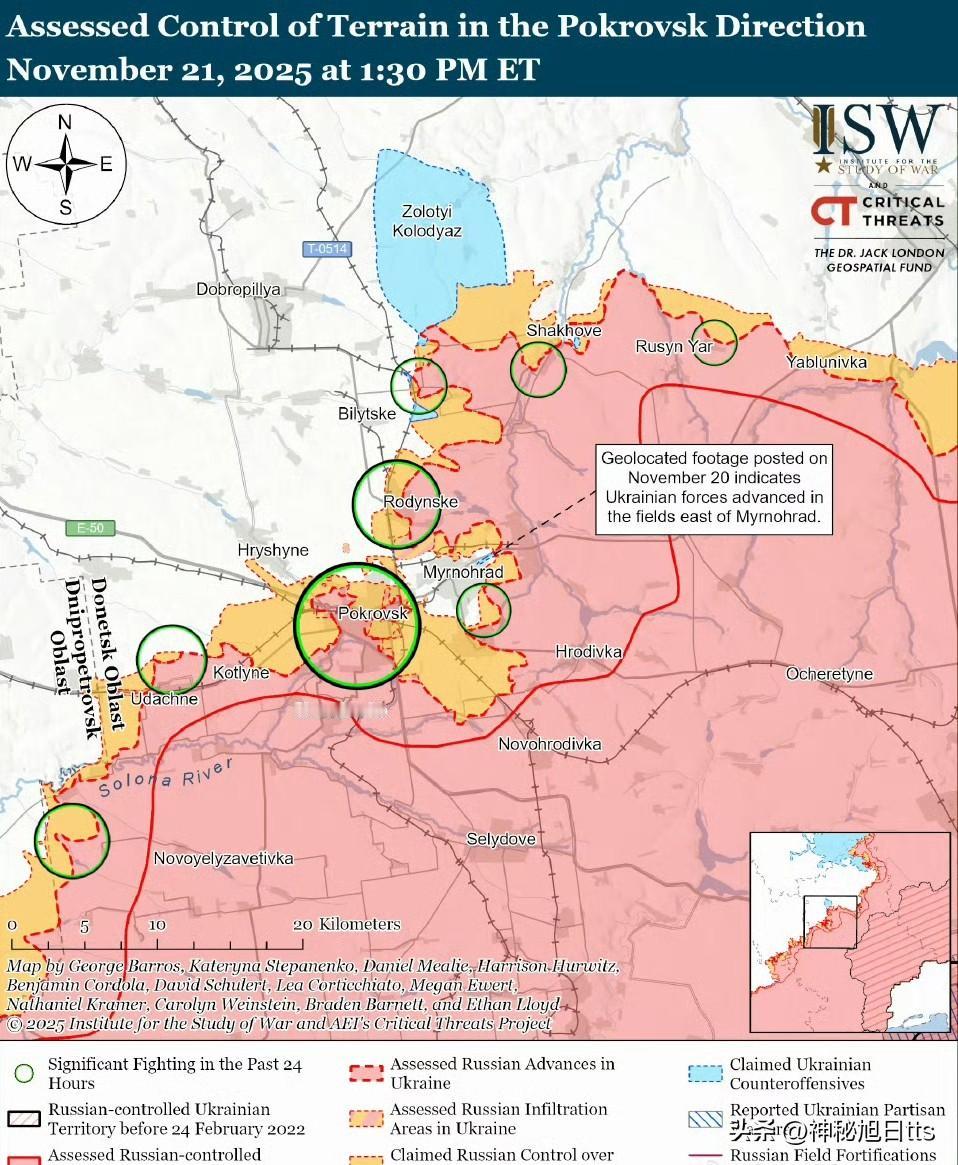 乌克兰军队继续在波克罗夫斯克方向发起反击,该地区局势依然严峻且瞬息万变。乌克兰军队近期在波克罗夫斯克及其周边地区取得进展,并持续阻击俄军在该地区的推进。11月20日和21日发布的地理定位视频显示,乌克兰军队近期沿T-0515波克罗夫斯克-多布罗皮利亚公路向南推进至罗丁斯克(波克罗夫斯克以北),并向东北方向推进至米尔诺赫拉德(波克罗夫斯克以东)。波克罗夫斯克本身仍处于争夺之中,凸显了前线的流动性和交错性。乌克兰空降突击部队第7快速反应军于11月21日报告称,乌克兰军队在波克罗夫斯克北部控制了既定防线,并在顿涅茨克铁路以南保持阵地。第7军还报告称,乌克兰军队正在将俄军从米尔诺赫拉德北部郊区清除出去。俄罗斯军事博客作者也承认,乌克兰军队在波克罗夫斯克市内、科扎茨克(米尔诺赫拉德以东)和普罗明(科扎茨克东南)之间、以及苏赫亚尔(波克罗夫斯克东南)和苏赫亚尔东北方向的铁路线之间保持着存在。 俄军继续使用无人机和滑翔炸弹袭击波克罗夫斯克方向的乌克兰地面交通线。乌克兰无人机营发言人报告称,俄军正使用制导滑翔炸弹猛烈打击波克罗夫斯克,并依靠俄罗斯“鲁比孔”无人技术中心——该中心在俄军战场空中封锁行动中取得的成功中发挥了重要作用。该发言人补充说,“鲁比孔”在波克罗夫斯克方向拥有数量不限的无人机和训练有素的操作人员。乌军旅发言人报告称,俄军增加了远程光纤无人机的使用,并重点打击乌克兰无人机操作人员。该发言人指出,俄军还在乌克兰地面交通线沿线使用“等待者”无人机。