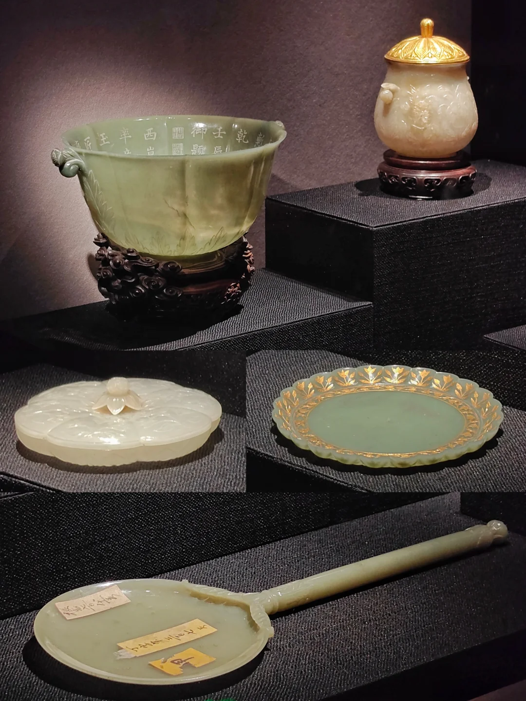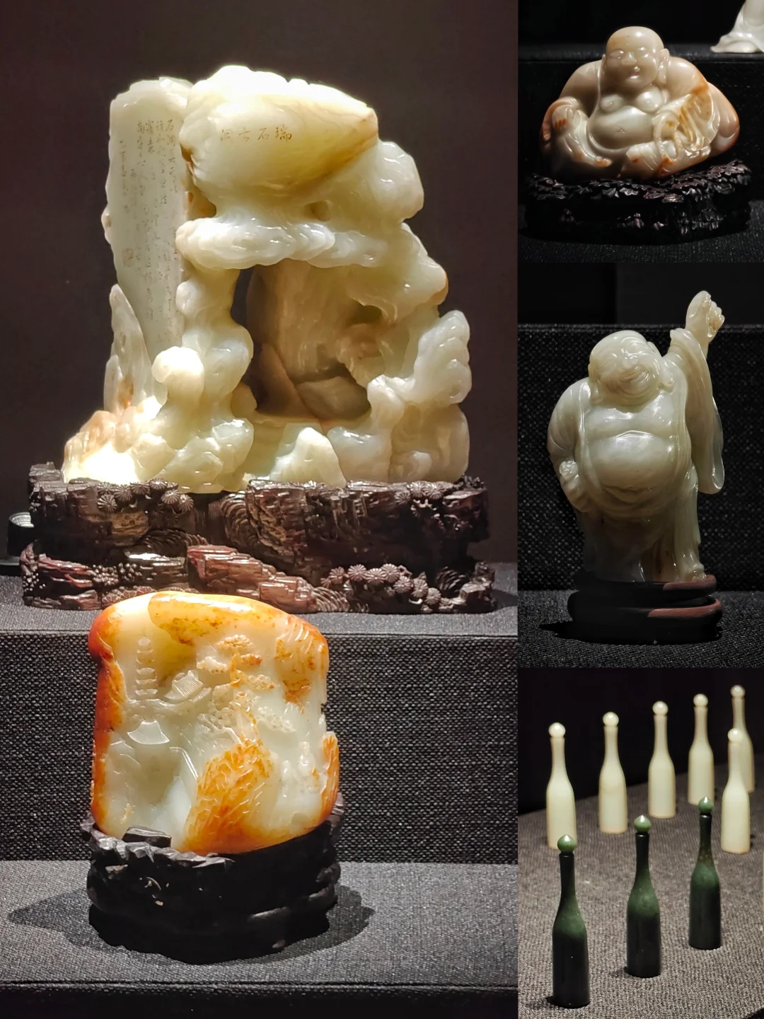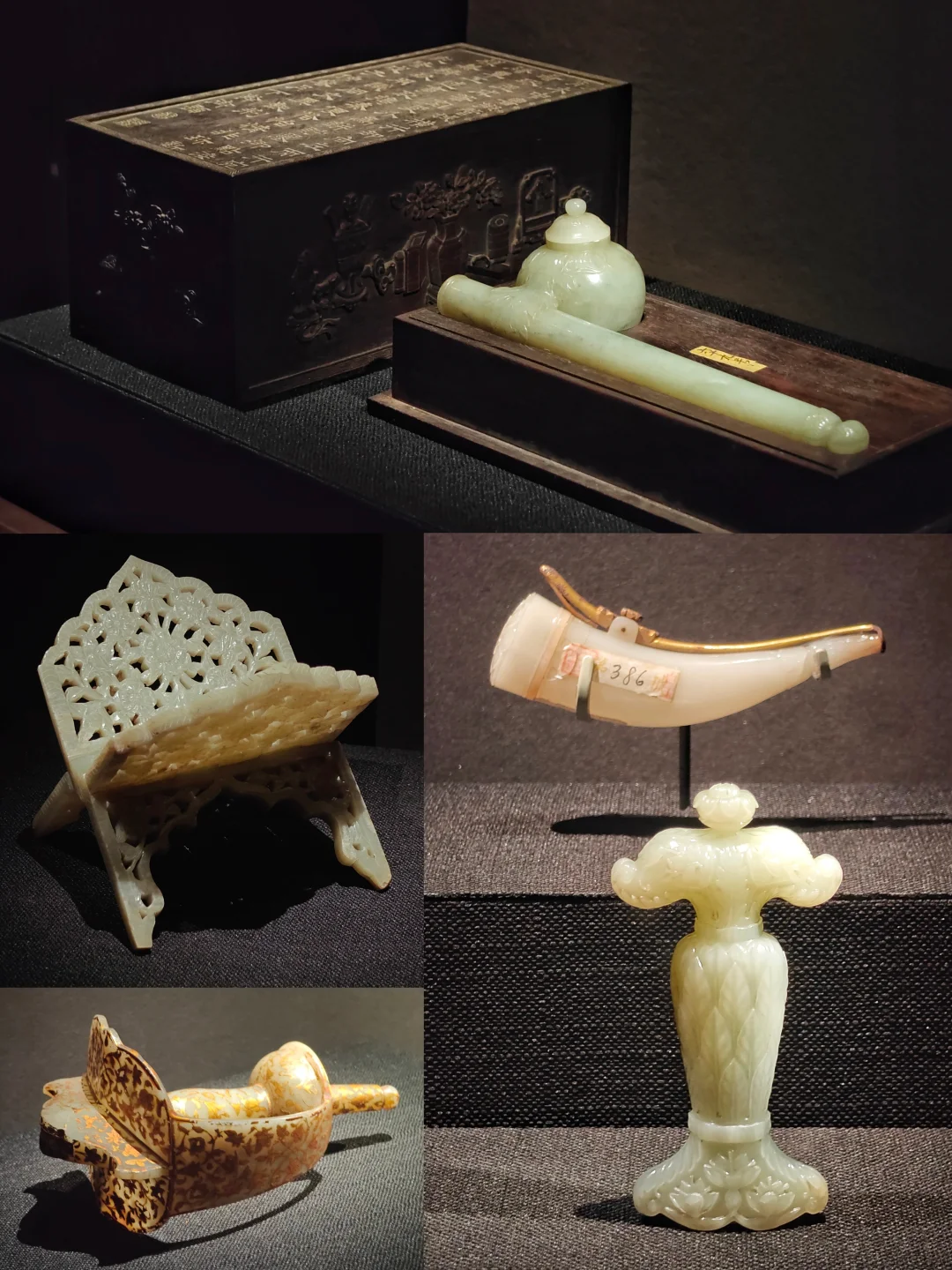 🔹白玉:乾隆御题采玉图山子、献宝图方带板、乾隆御题碗、灵芝福寿纹执壶、“春水”图佩、牡丹纹“玉逍遥”、双立人耳炉