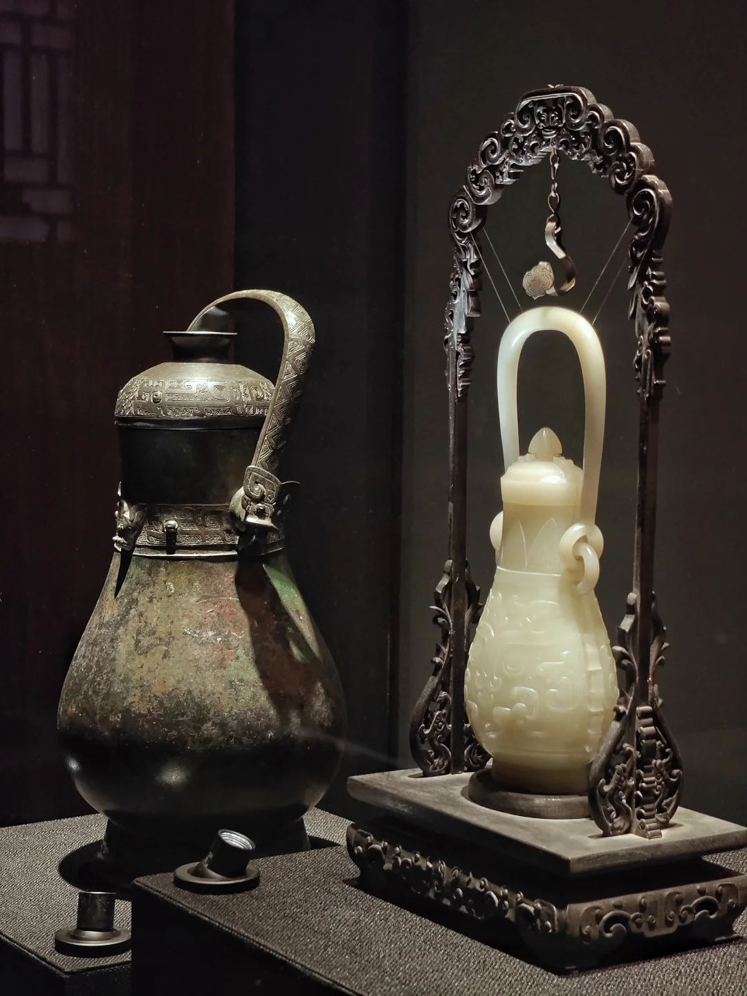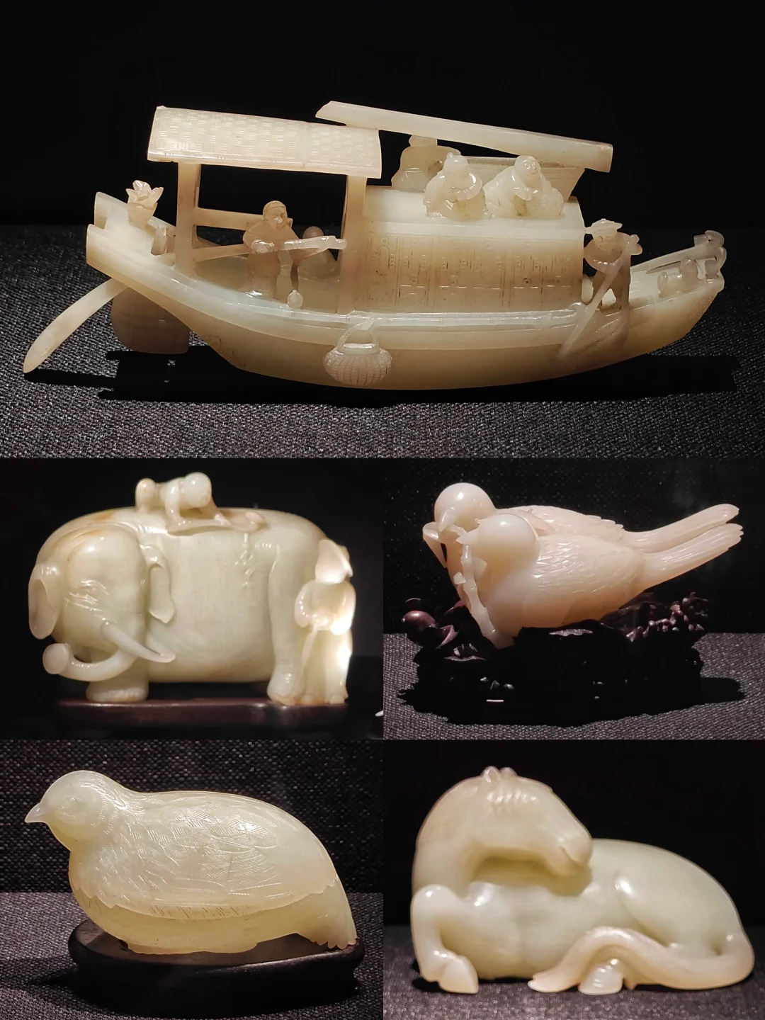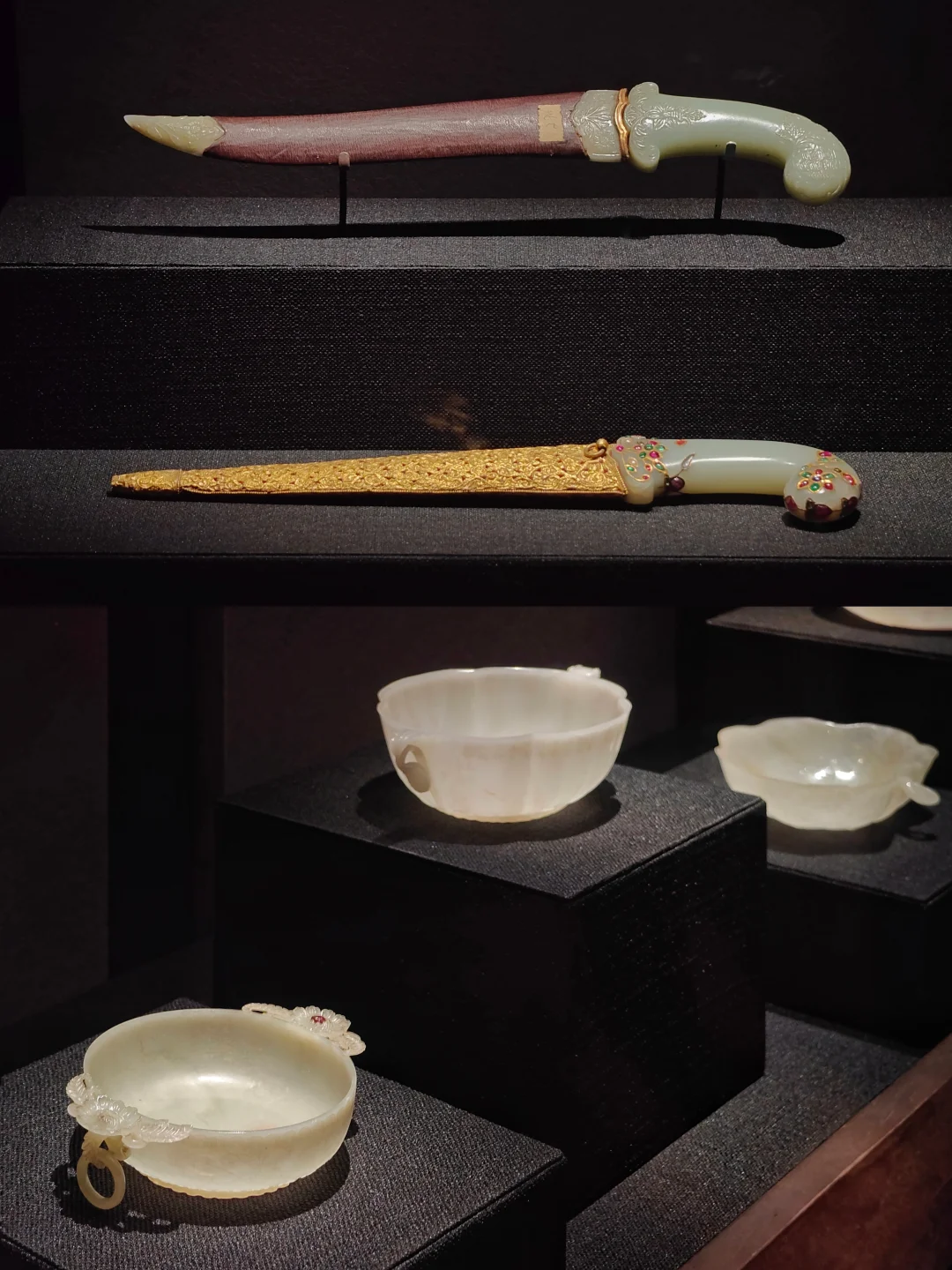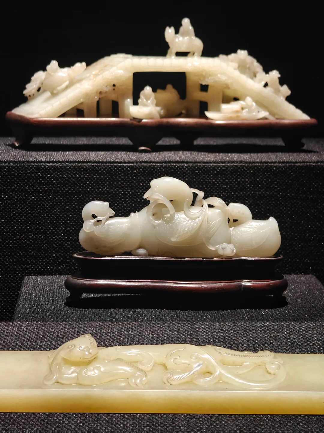 🔹白玉:乾隆御题采玉图山子、献宝图方带板、乾隆御题碗、灵芝福寿纹执壶、“春水”图佩、牡丹纹“玉逍遥”、双立人耳炉