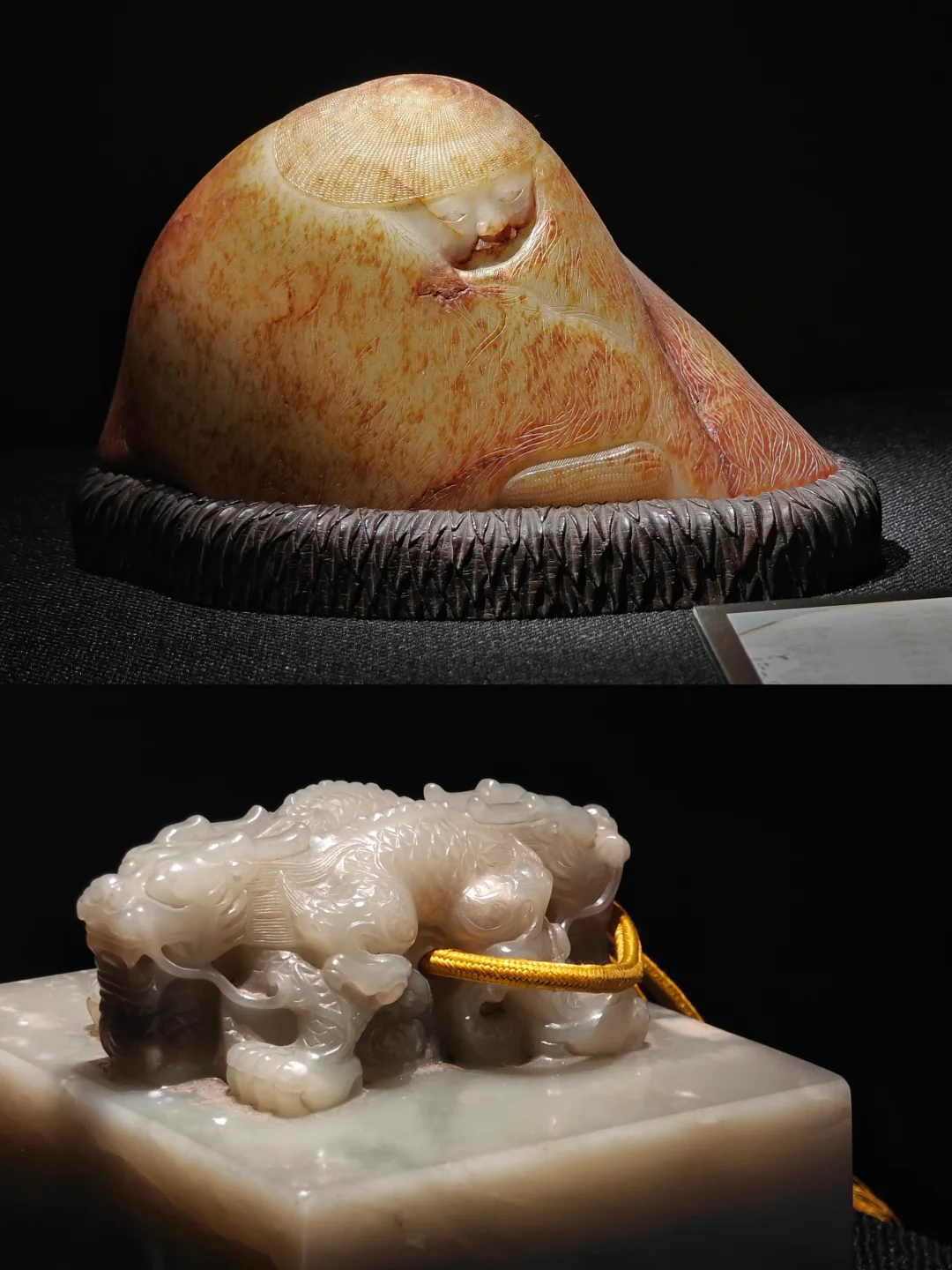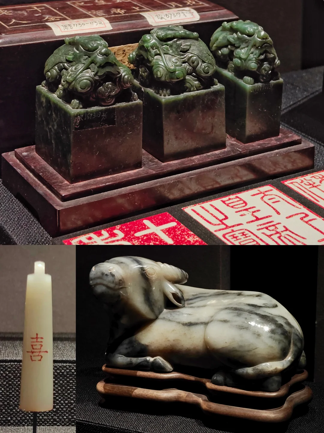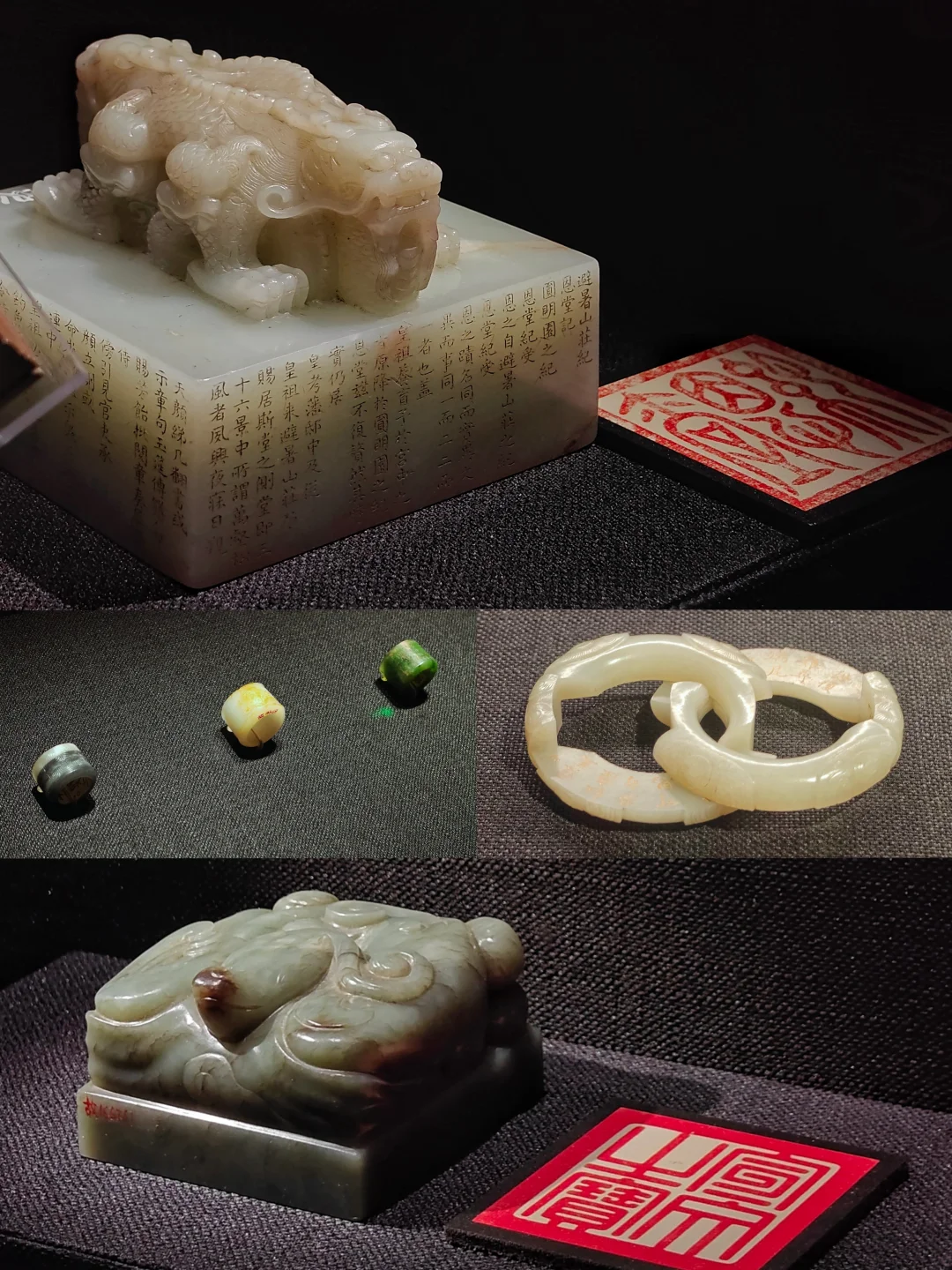 🔹碧玉:龙钮“梨花伴月”、龙钮“十全老人”印、龙钮“太上皇帝之宝”、兽面卧蚕纹璧、释加牟尼佛、莲瓣式供托