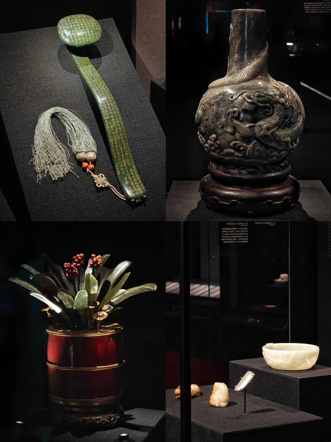 🔹碧玉:乾隆御题龙尾觥、乾隆款夔龙纹兽耳簋式炉、填金“五福五代堂记”如意、红釉筒式盆万年青盆景、乾隆御题竹溪六逸图笔筒