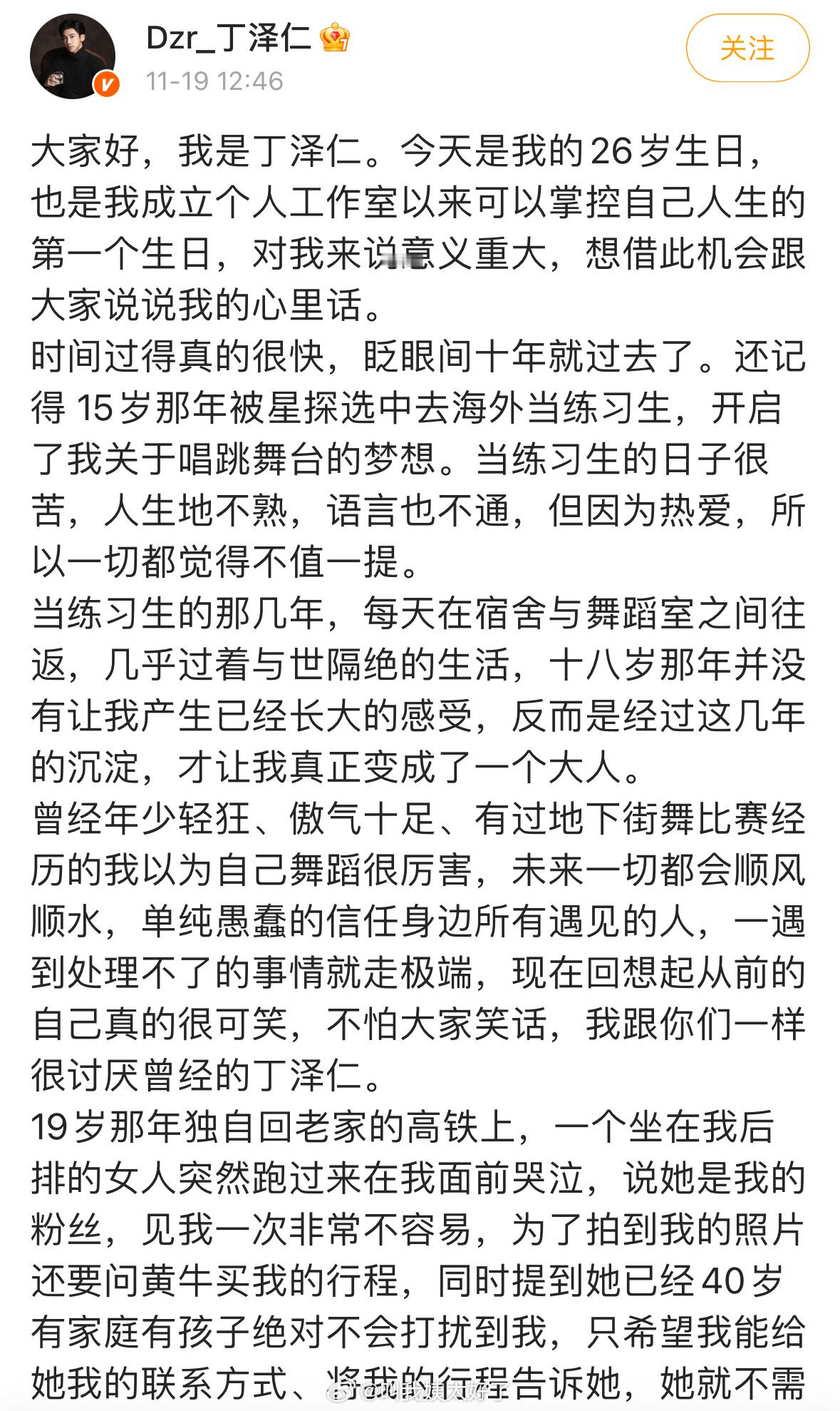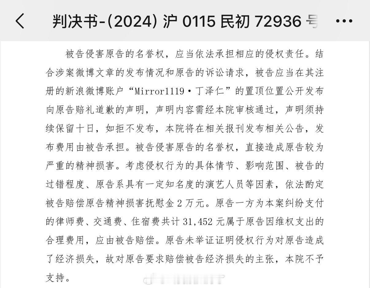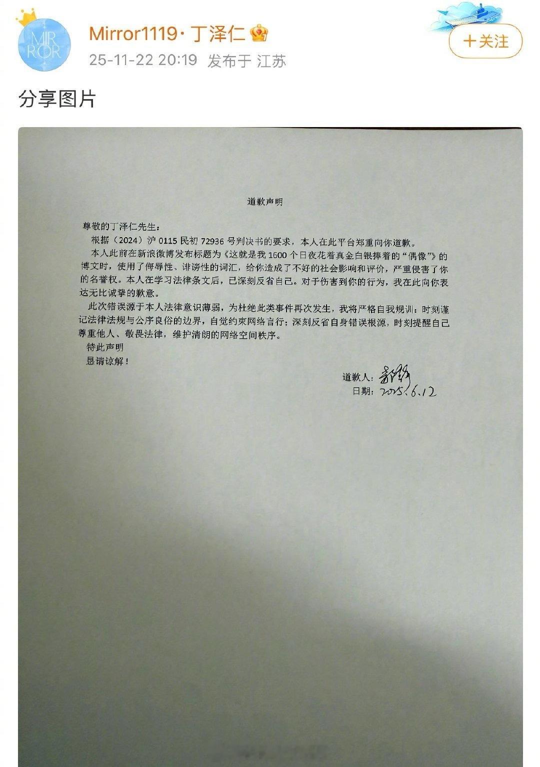 丁泽仁11月19日的时候发微博为自己洗白(图9-图10),称自己受到了“唯一的姐”精神控制,但自己清清白白感情专一。现在唯一的姐晒出了判决书(图2-8),划重点:1.原告(丁泽仁)与被告(唯一的姐)存在恋爱关系;2.恋爱期间出轨、私生活混乱、上门服务等滥交行为具有基本事实依据,被告没有污蔑原告;(图3)3.被告因为说QJ、全裸等一些词侮辱了原告的人格尊严,侵害了丁的名誉权,所以“唯一的姐”给丁泽仁写了道歉书、转了5万块钱赔偿款。(图7-8)