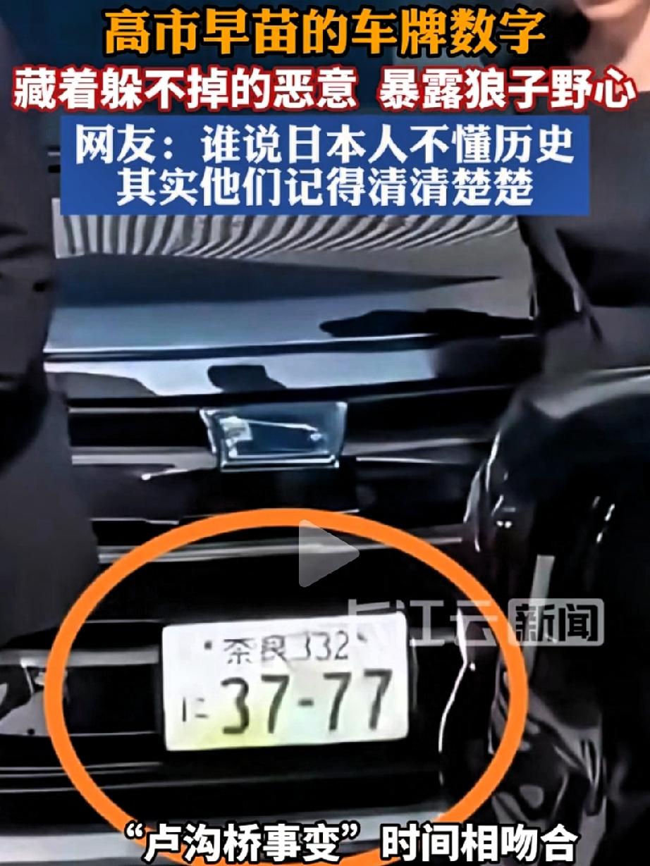 一个车牌号,何以成为暴露野心的铁证? 高市早苗的“37-77”就是答案。这串数字绝非偶然,其中“37”被广泛解读为1937年——日本全面侵华战争的“七七事变”之年。选择这一充满战争伤痕与历史伤痛的数字,本身就是一种极具挑衅意味的政治表态。 这看似微小的个人选择,实则是对历史正义的公然挑战,更是对曾深受其害的邻国情感的肆意践踏。它暴露出的,是一种对历史毫无敬畏之心的冷漠与傲慢。 因此,这个车牌号躲藏不掉其内心深处的恶意,也赤裸裸地暴露了她妄图为军国主义招魂、颠覆战后和平秩序的狼子野心。