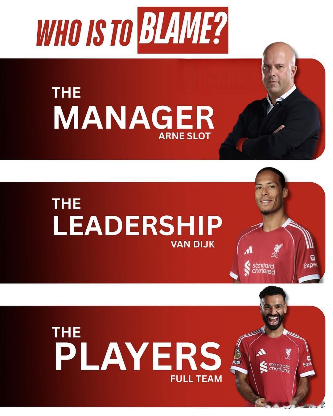 近11场比赛输掉8场,近两场更是均以0-3完败。利物浦本赛季状态急转直下,问题究竟出在谁身上? A、主教练斯洛特? 本赛季利物浦最大的问题就是打法毫无章法,传控缺乏穿透性、后防漏洞百出、快攻战术难以施展、新援磨合进度迟缓、攻防模式单一……这些问题主教练就该背锅。 B、队长范戴克? 如今利物浦的比赛就像一盘散沙,看不到团队的求胜欲望,球员间互相摊手的场景愈发频繁。作为队长,维护更衣室的稳定是他的重要职责。是时候找萨拉赫、维尔茨、科尔克兹、加克波、赫拉芬贝赫、科纳特等人好好聊聊了。 作为后防核心,利物浦12场英超比赛丢20球,在全英超排名倒数第四。这样的成绩对于后防领袖而言,显然是不合格的。 C、核心球员们? 萨拉赫顶薪续约后状态低迷,门前配合的意愿也有所降低。花费4.5亿引进的强援们,除了埃基蒂克在染红前表现尚可,其他球员的表现实在糟糕。科纳特、麦卡利斯特、罗伯逊,三人的表现也与人们的期待差距越来越大。