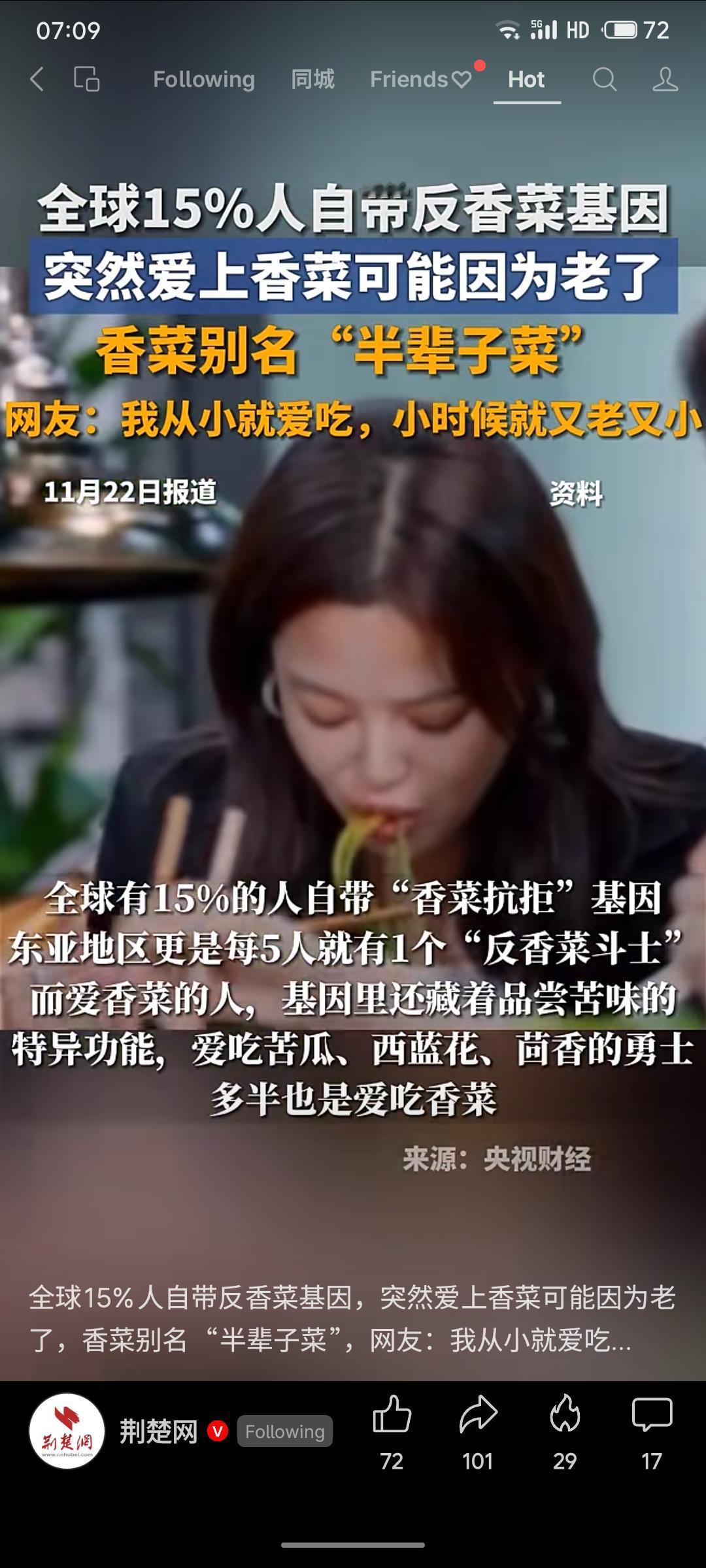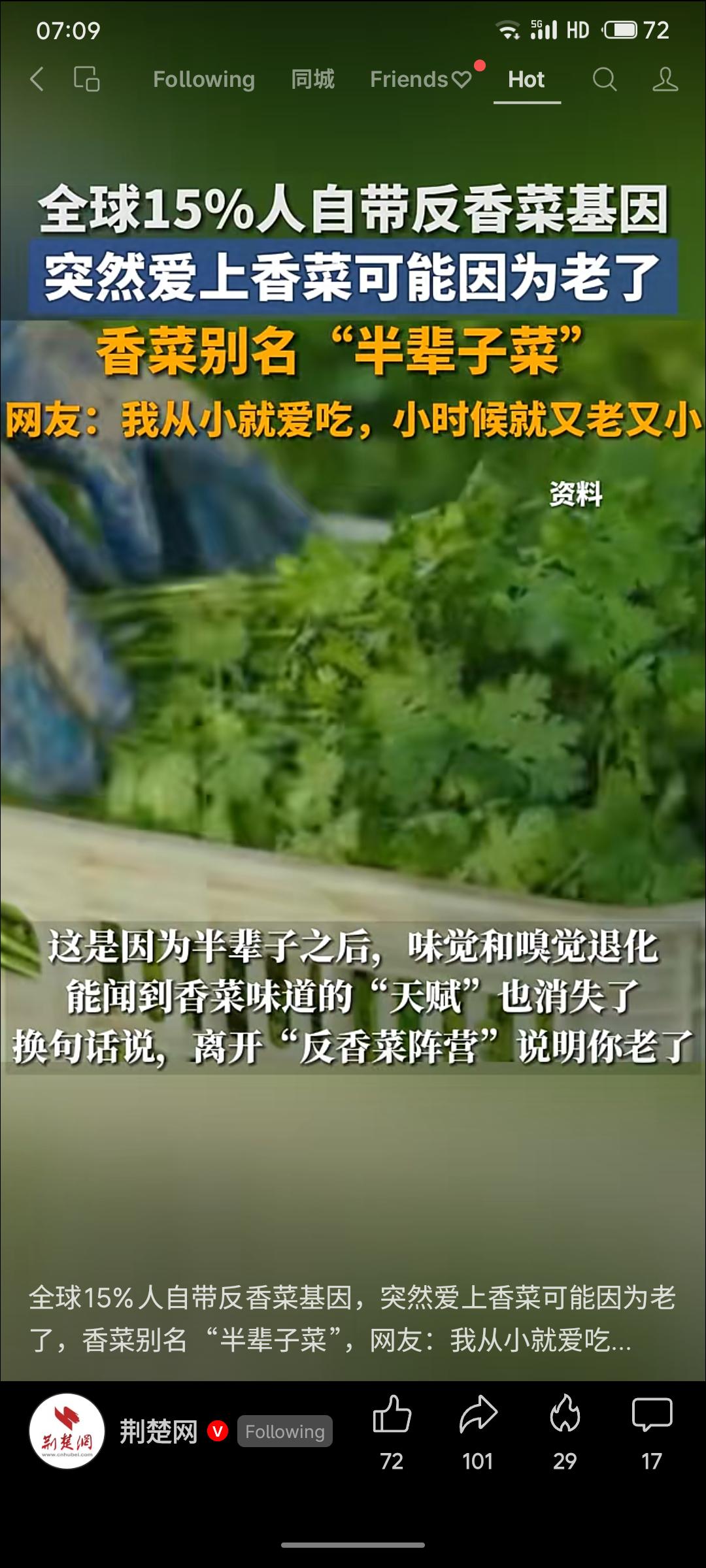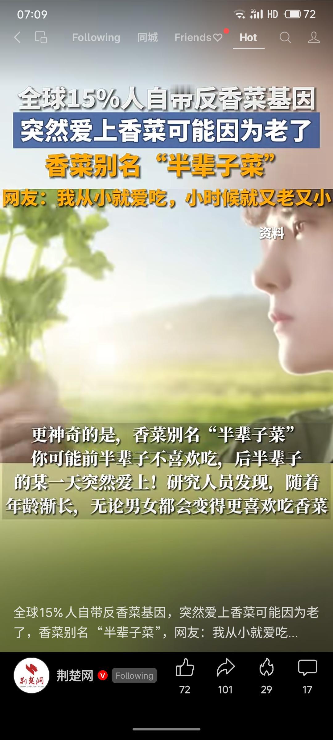 科学研究显示,全球约15%的人因OR6A2基因对香菜味道敏感,导致厌恶,香菜因此得名“半辈子菜”。随着年龄增长,味觉嗅觉退化,部分人可能由恨转爱。东亚地区“反香菜斗士”比例高达每五人一人。
