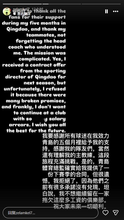 赛季结束,连夜逃离,中超第一个逃离的外援! 青岛海牛的大腿外援兰克尔疑似跑路了。在打完中超最后一轮以后连夜跑路~ 兰克尔发社媒,显示其已经到了伊斯坦布尔机场,并且其发文逃离的原因,欠薪! 兰克尔说:“青岛体育总监确实给我提供了一份下赛季的合同,但很遗憾,我拒绝了,因为他们之前有很多承诺没有兑现,坦白说,我不想继续留在一家拖欠这么多工资的俱乐部!” 不过中超收官之战兰克尔并没有出战,不知道是不是和欠薪有关系。说白了老板画大饼那一套忽悠不住这个外援了。就像兰克尔说的:“我无法与不尊重球员的俱乐部续约,承诺都是空话,我们通过FIFA解决吧。” 显然兰克尔准备甚至已经向FIFA递交资料了。 兰克尔半个赛季加盟青岛海牛,出战13场,打进了8球2助,为青岛海牛的保级立下大功! 不过本赛季青岛海牛经常承诺所谓的赢球奖,据说关键的保级大战赢球奖都达到了400万,怎么会拖欠那么多的工资,估计是其他的承诺无法实现!其实中国老板几乎都有画大饼的习惯,就用这个来忽悠手下人,可是人家外国人不听你这套啊.....