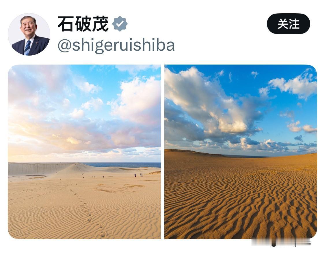 日本前首相石破茂发云卷云舒的风景照,疑似不满高市早苗的战争言论。刚刚卸任的石破茂,态度更为温和务实,并反对战争。 在高市早苗发表好战言论之后,石破茂并没有公开表态,但石破茂发了一组照片,可能说明了他的心境。 石破茂发了家乡鸟取沙丘的风景照,没有留下文字。一般网友认为,这是石破茂从首相位置退下之后,淡泊明志,寄情山水的意思。但也有人认为,在中日关系紧张之际,石破茂以风景照暗示中立心态,希望双方各退一步,海阔天空。