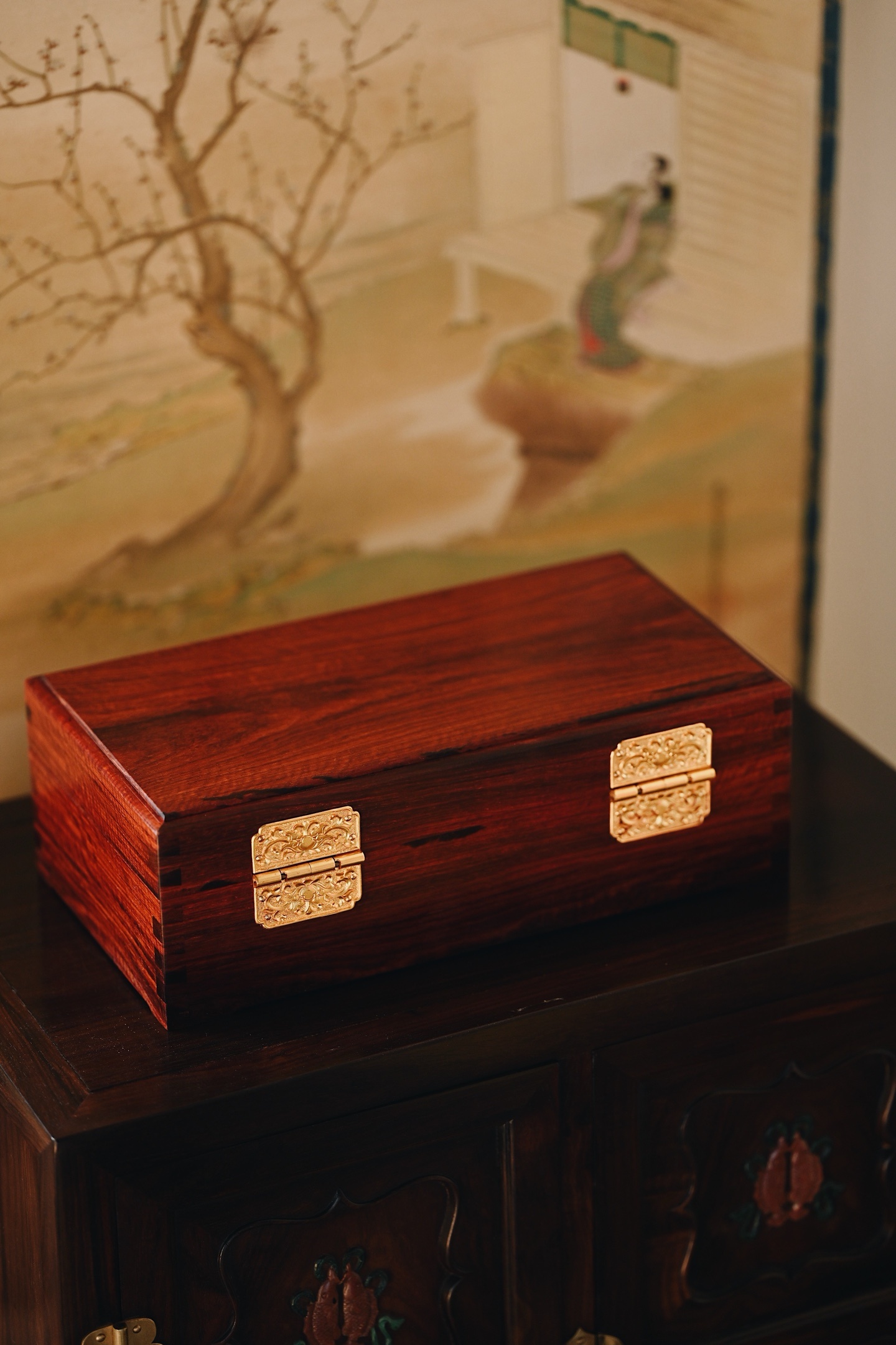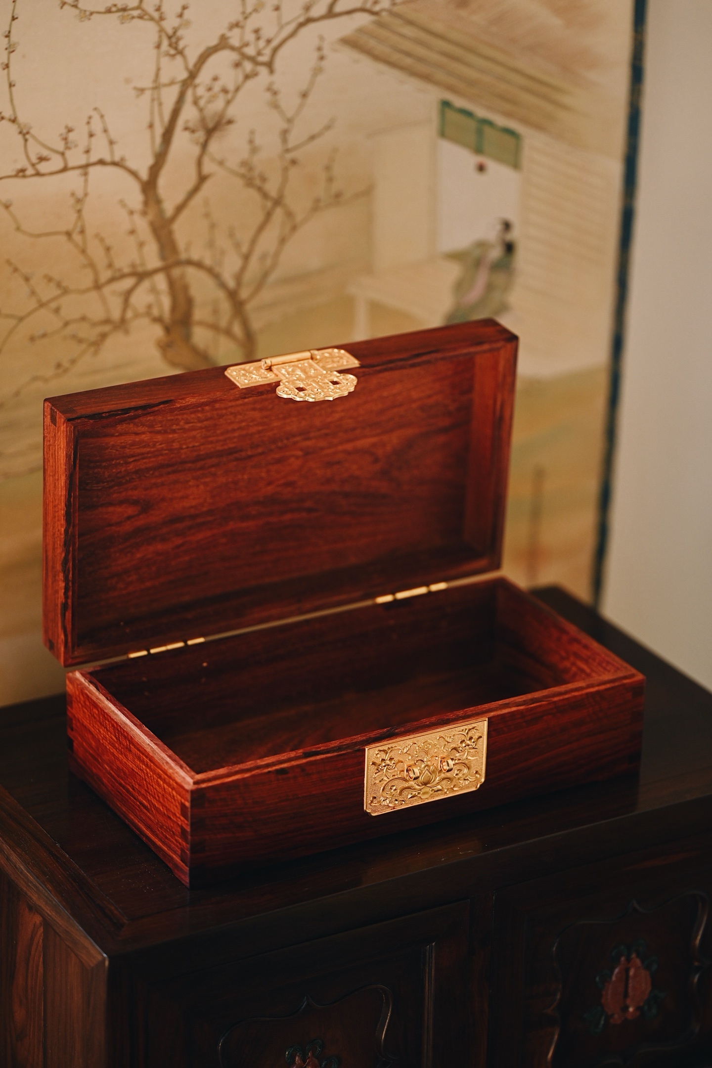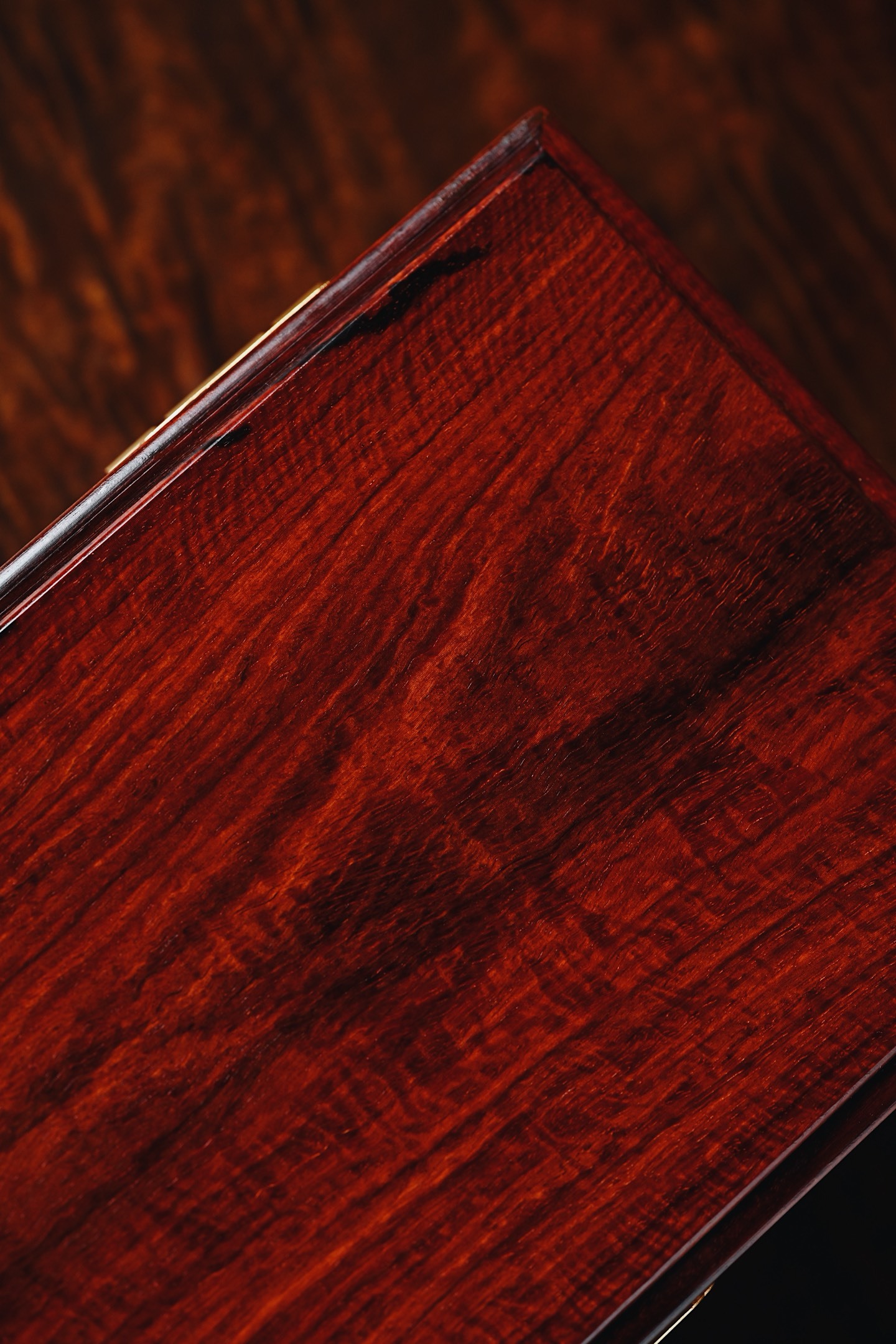小叶紫檀满水波 | 收纳盒独板质地细腻,料质油润,满水波纹理随光而动,潋滟亮眼,周身素雅无雕,尽显紫檀纹理之美,色润工细,可纳首饰、章石、茶叶等,为藏用佳选。25*13.5*8.2cm 880g