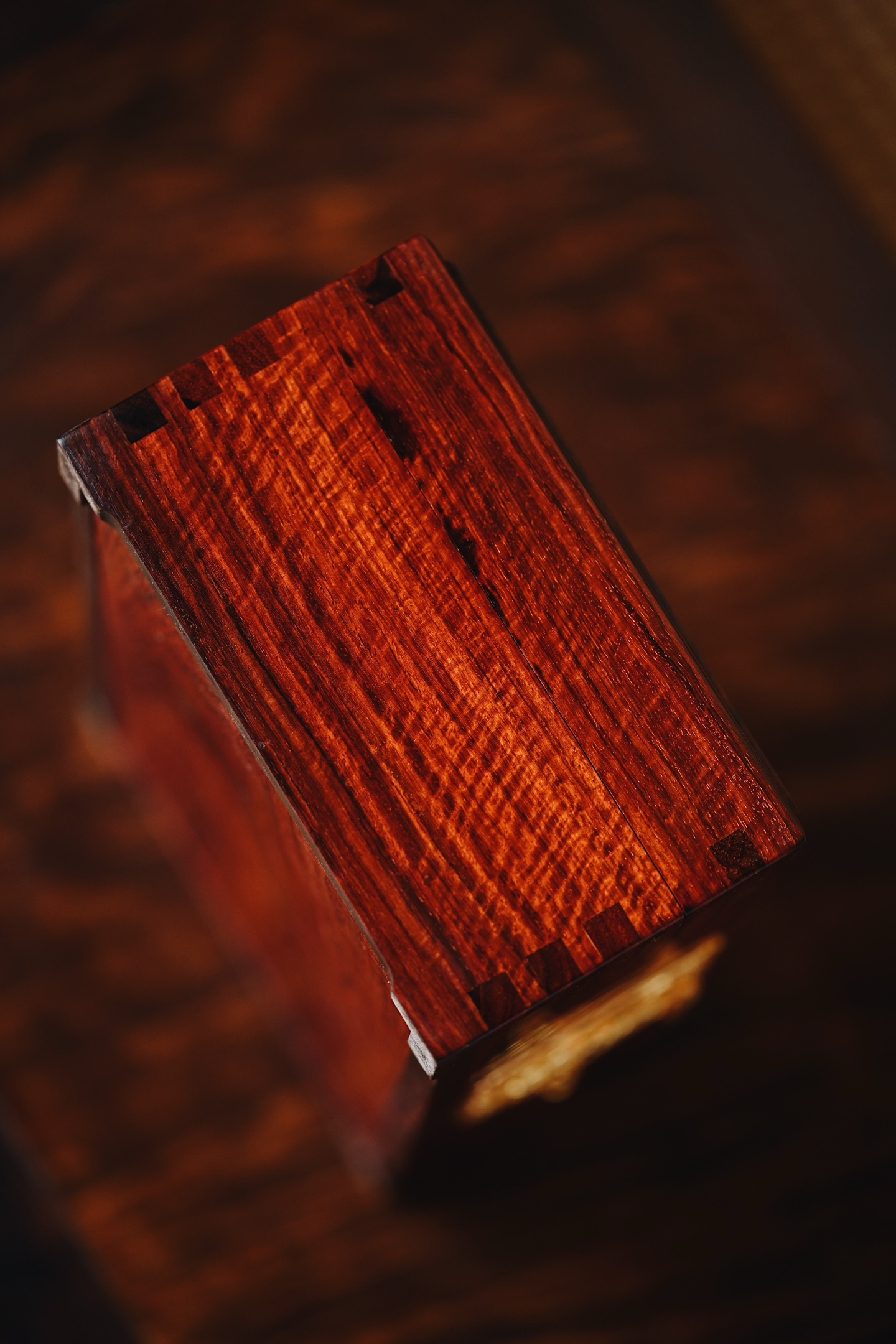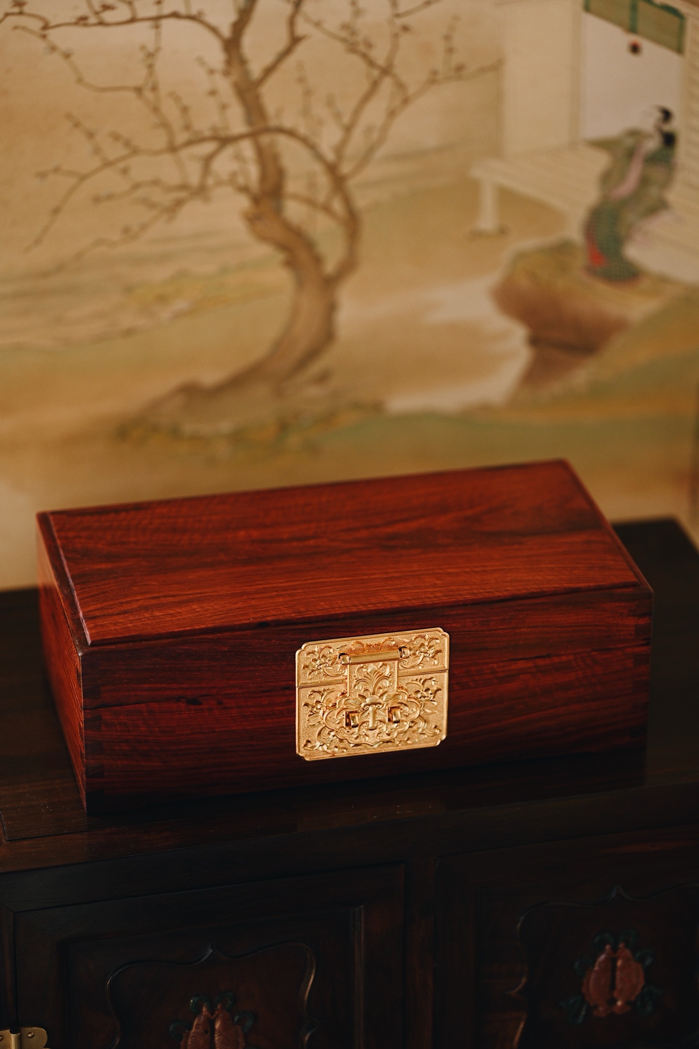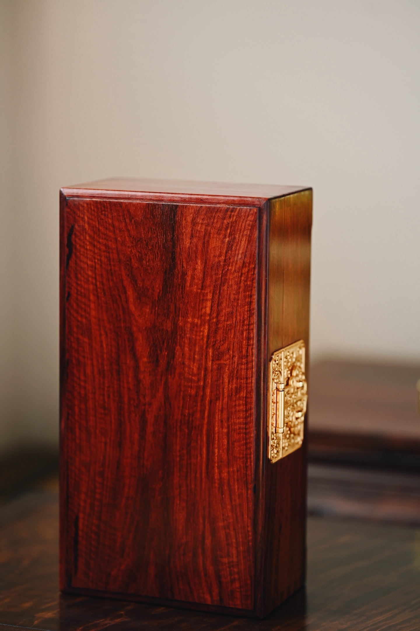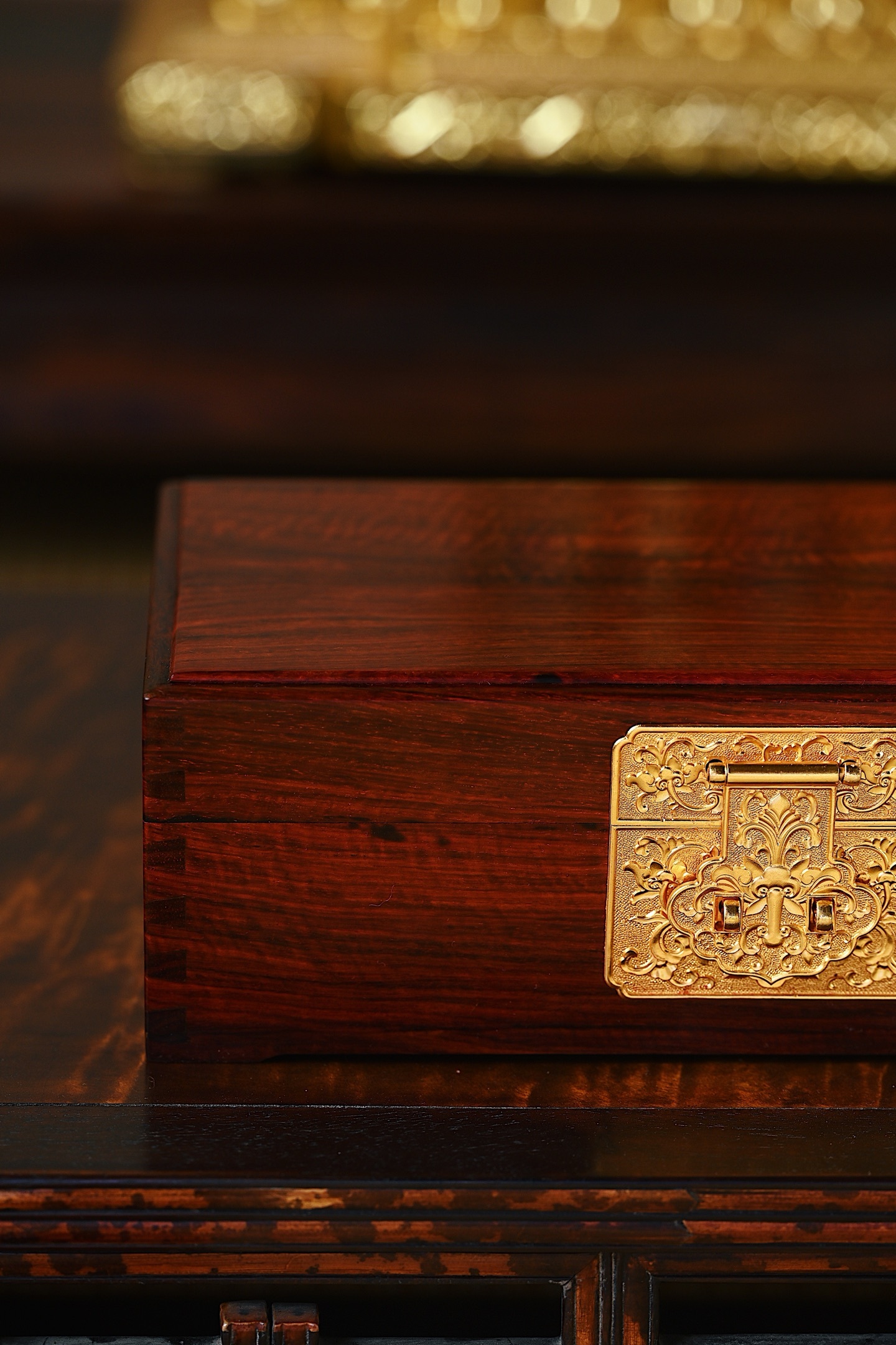 小叶紫檀满水波 | 收纳盒独板质地细腻,料质油润,满水波纹理随光而动,潋滟亮眼,周身素雅无雕,尽显紫檀纹理之美,色润工细,可纳首饰、章石、茶叶等,为藏用佳选。25*13.5*8.2cm 880g