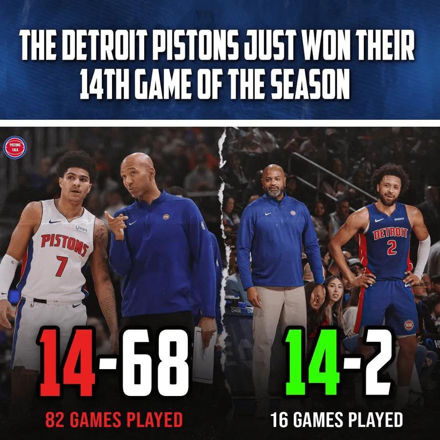 活塞今天战胜雄鹿豪取12连胜,战绩来到了14胜2负,2年前活塞老板跪求蒙蒂给他1亿接受活塞幻想重塑汽车城辉煌,但是蒙蒂交给老板的答案就是14胜68负,而比克斯塔夫今天只用了16场比赛就得到了14胜,看来主教练的差别还是很大的!