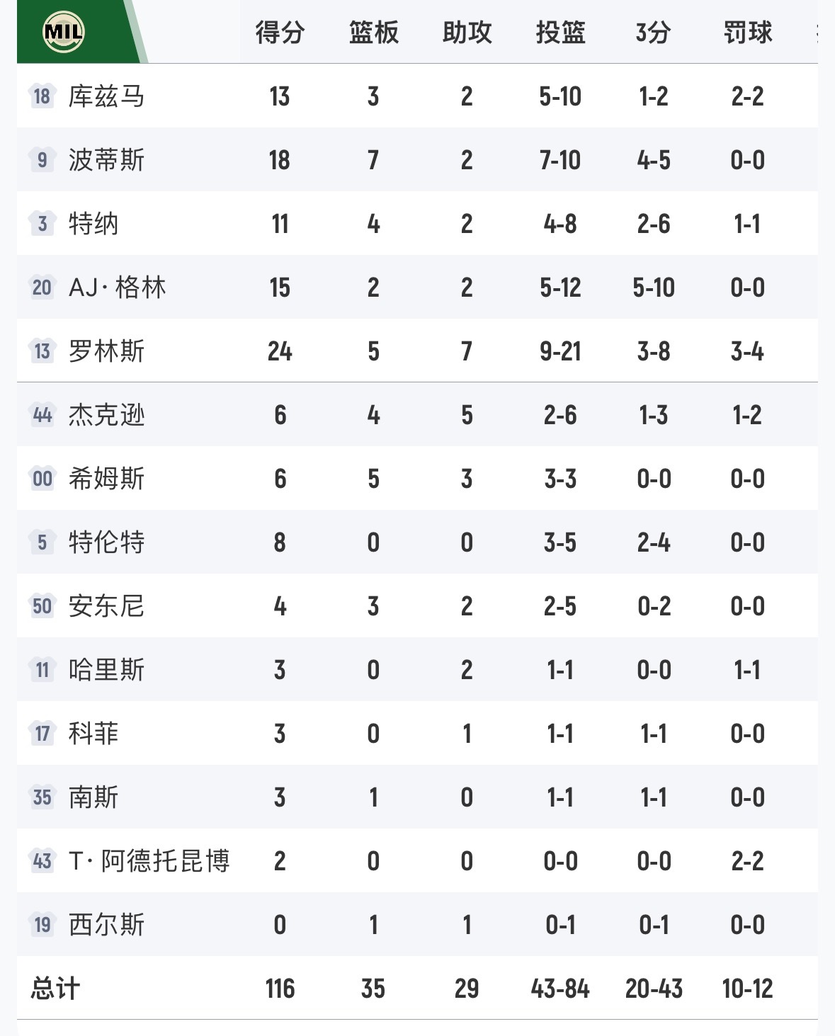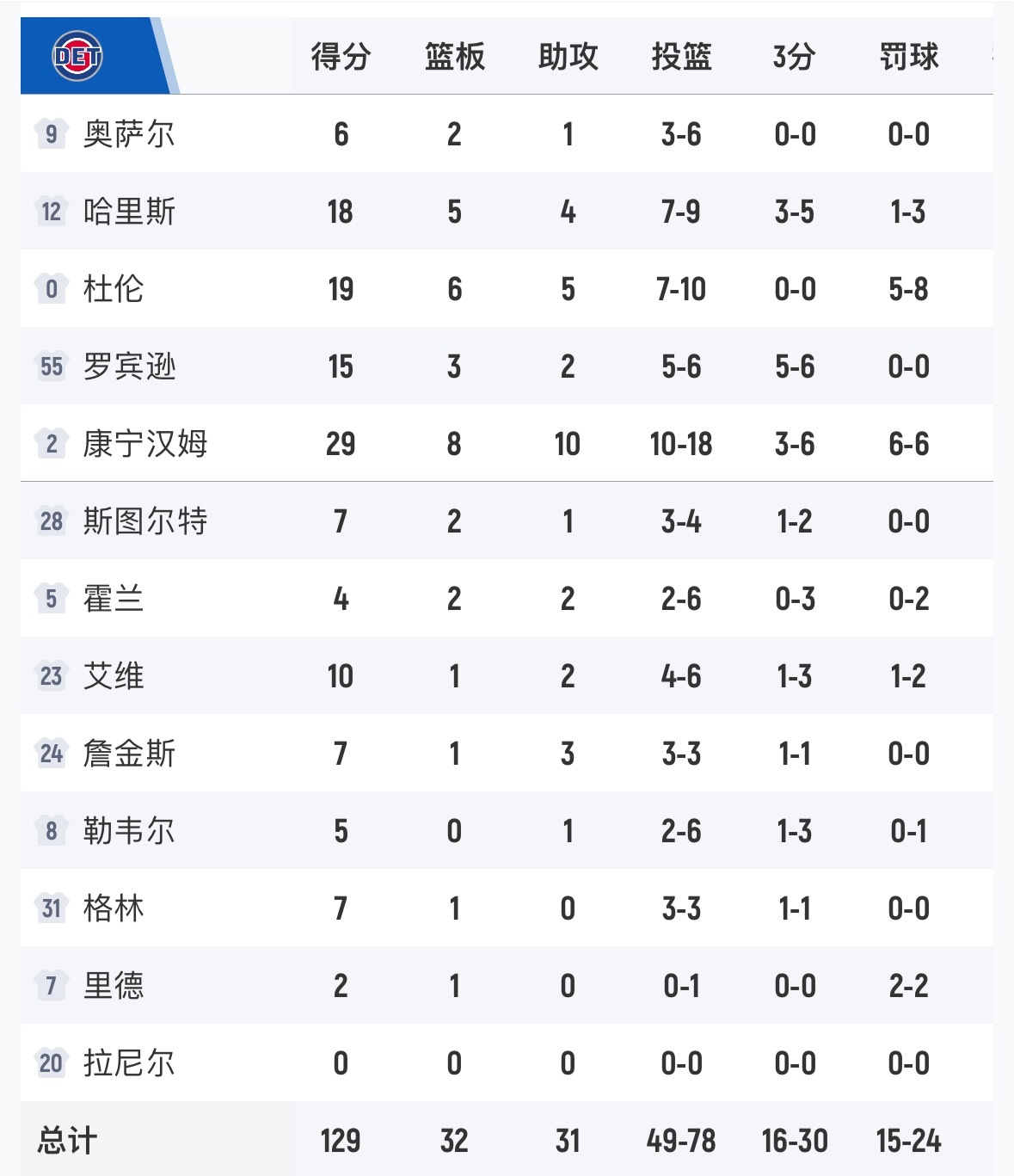 活塞129-116击败雄鹿,活塞目前已经12连胜。坎宁安29分8板10助攻,罗林斯24分5板7助攻。