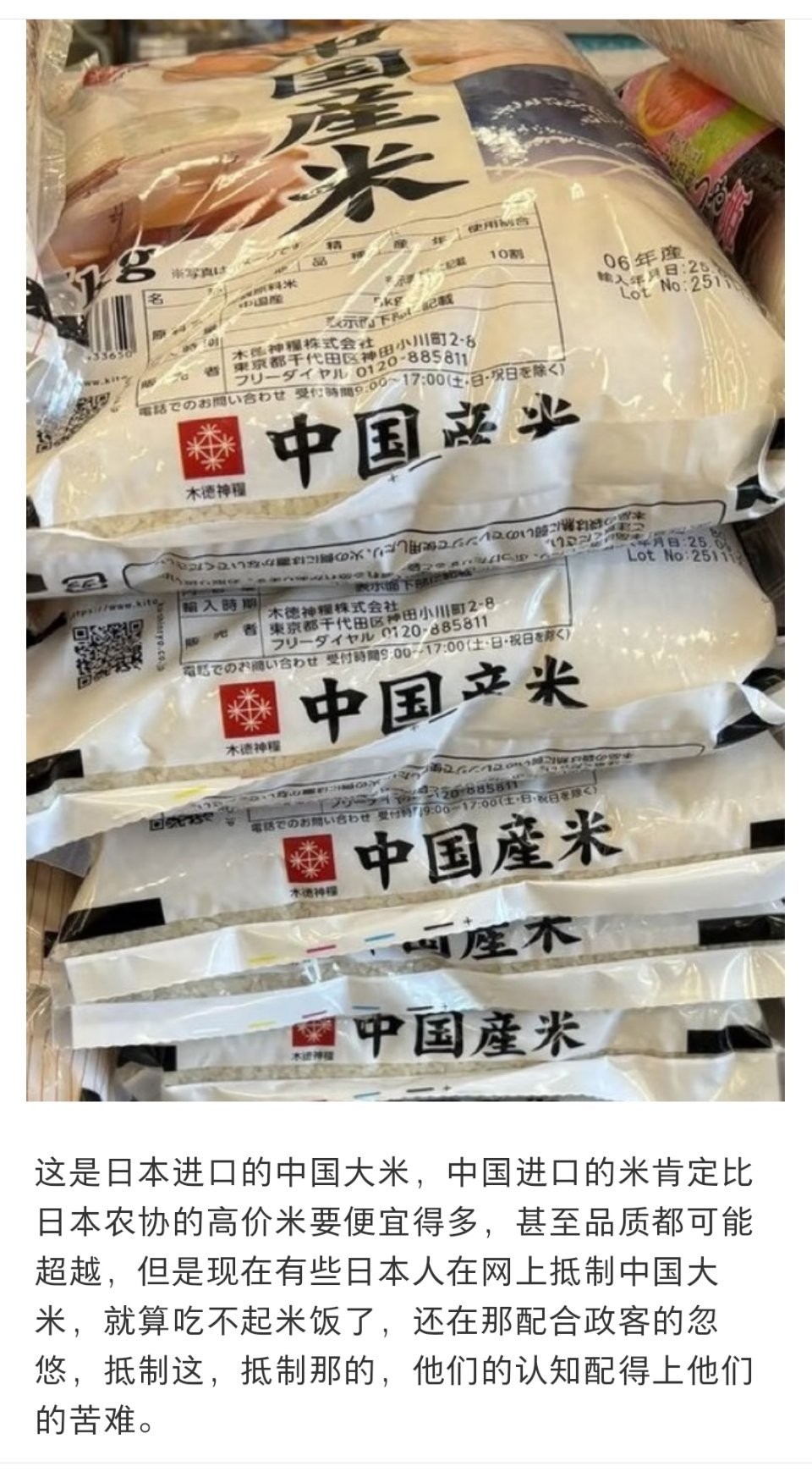 还能说啥呢?这些日本人的思想配得上他们的苦难。我们中国大米质量可比日本大米好,爱吃不吃。日本米价还有上升的空间。天天吃饭都抠抠搜搜的,哪有点发达国家的样子。