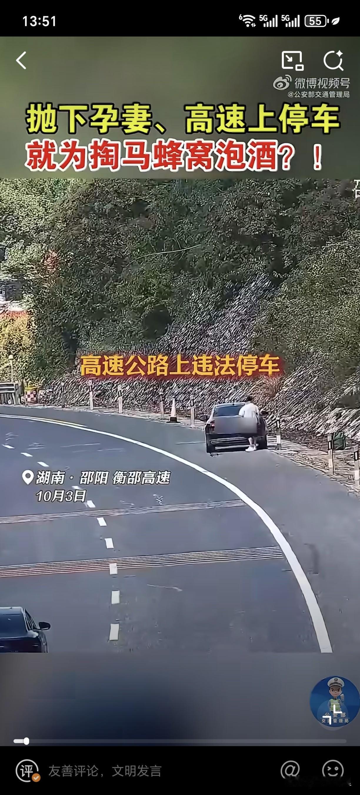 不是,这哥们是怎么想的[what],老婆还怀着孕,居然在高速上停车,还把老婆独自留在车里,结果就只是为拍个掏马蜂窝的视频?为了一点点流量就置自己和家人的生命安全于不顾,都是要当爹的人了,做事还这么毛毛躁躁的嘛?这也太不负责任了吧。 得亏交警发现的及时,不然后果不堪设想。扣9分罚200真算是轻的,说实话应该直接吊销驾驶证的,让其长长记性,再怎么想红,也别拿安全当儿戏。社会百态 高速 安全