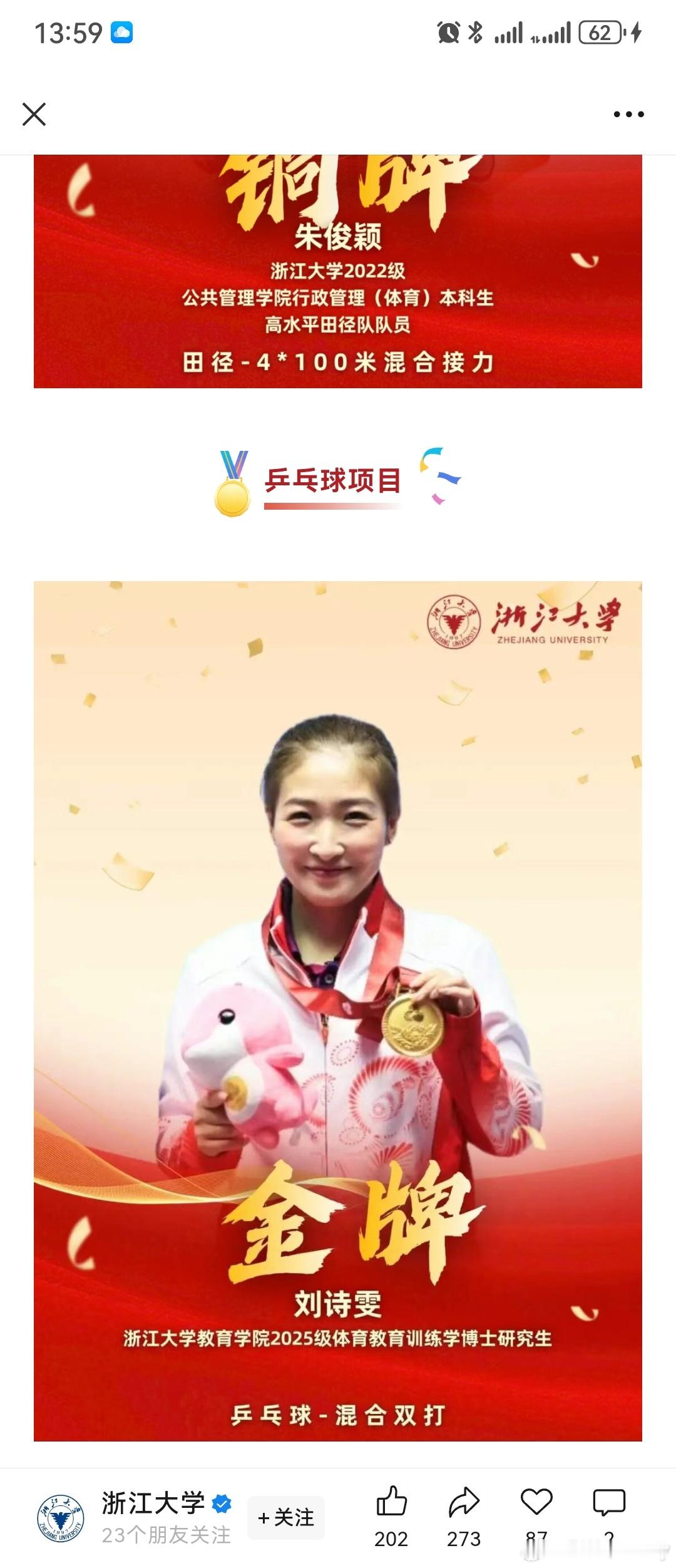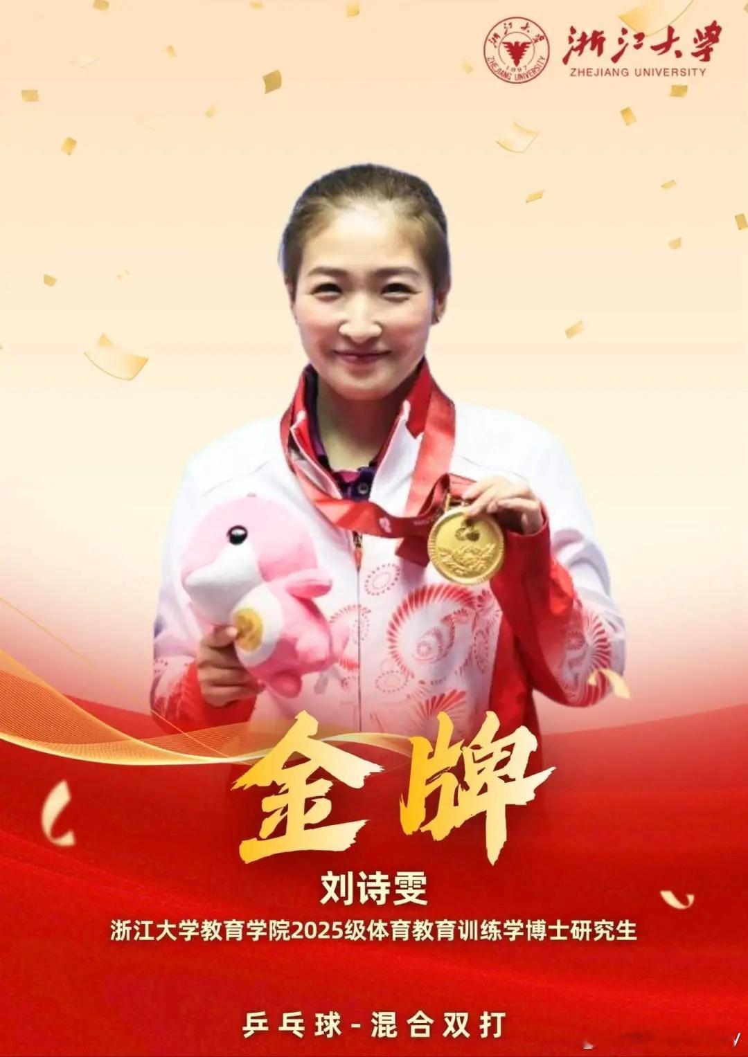 浙江大学今天(11月23日)发布标题为《8金5银7铜!浙大师生闪耀全运会!》的捷报,祝贺刘诗雯与搭档林高远夺得乒乓球混双金牌。小枣现在的身份是浙江大学教育学院2025级体育教育训练学博士研究生本次全运浙江大学53名参赛师生共斩获20枚奖牌(8金5银7铜)。
