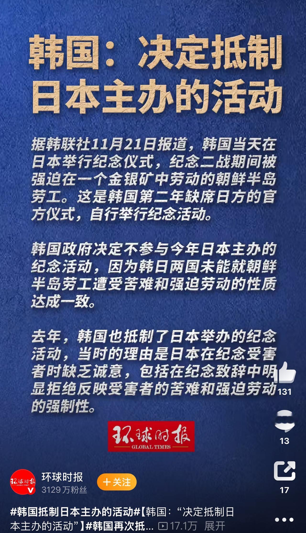 韩国除了在美国那站不直,其他的地方大部分还挺直的,尤其对日本!这回也挺刚,直接抵制日本举办的活动!拜托!大家别忘了,韩国现任总统李在明曾经可是为了抵制日本核污水排海而绝食半个月的人啊,差点把自己饿死!能惯着他们小日本吗?闹那!高市早苗会如何“作死”自己