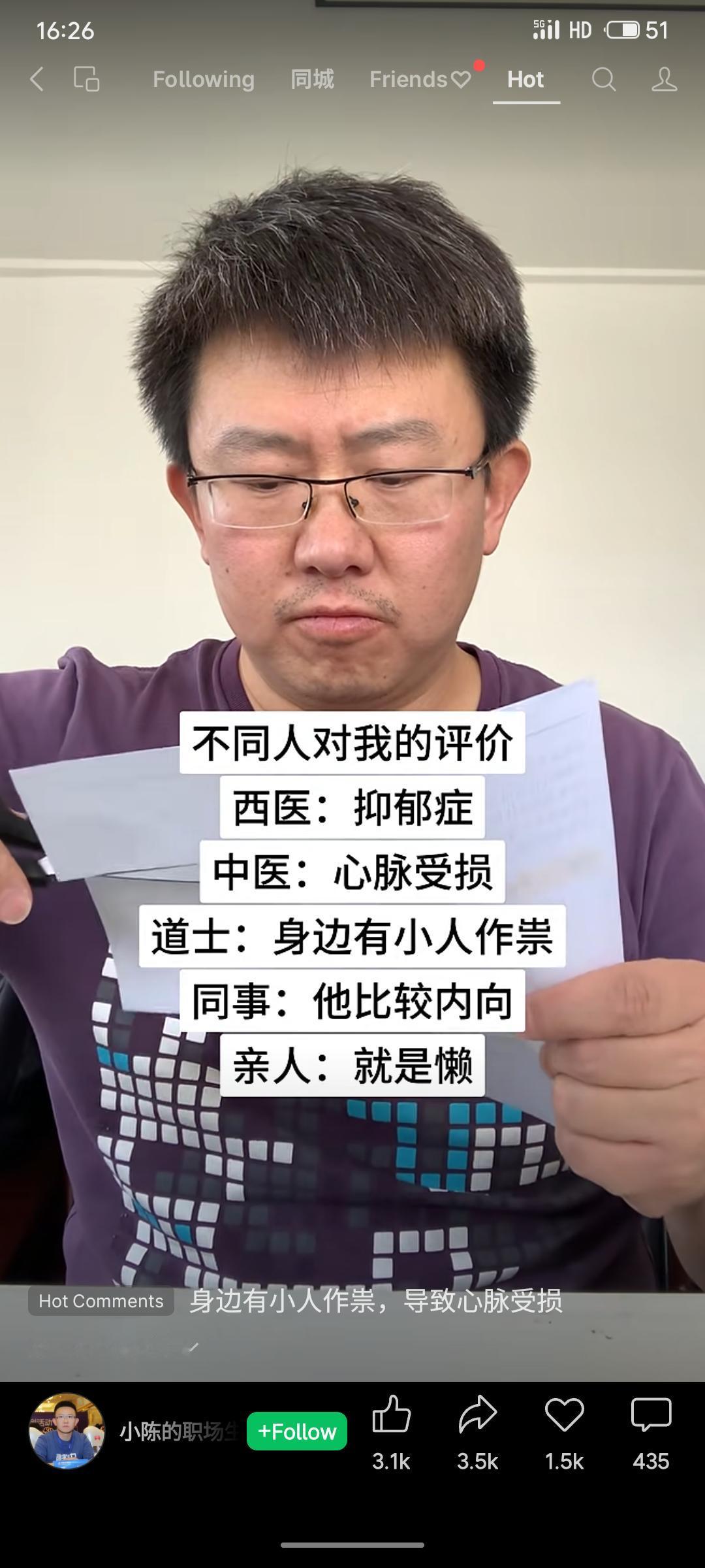 同一人的状态引发不同评价:西医诊为抑郁症,中医称心脉受损,道士归因小人作祟,同事认为内向,亲人则视作懒惰。展现了不同立场下的认知差异。