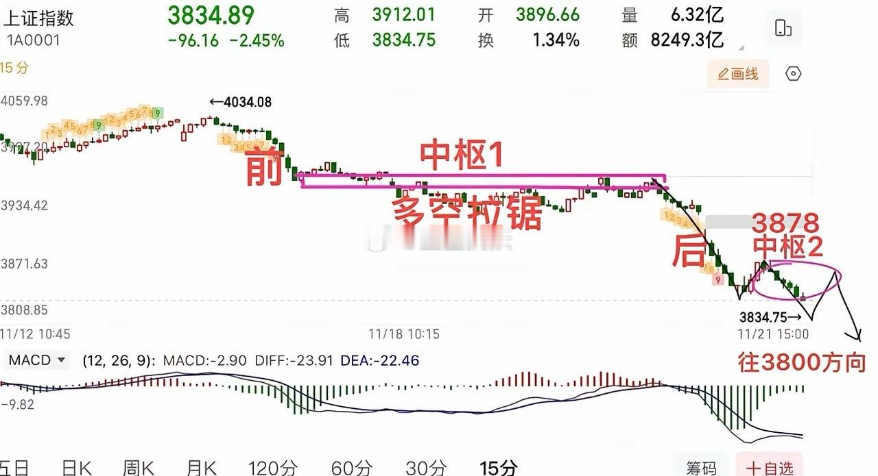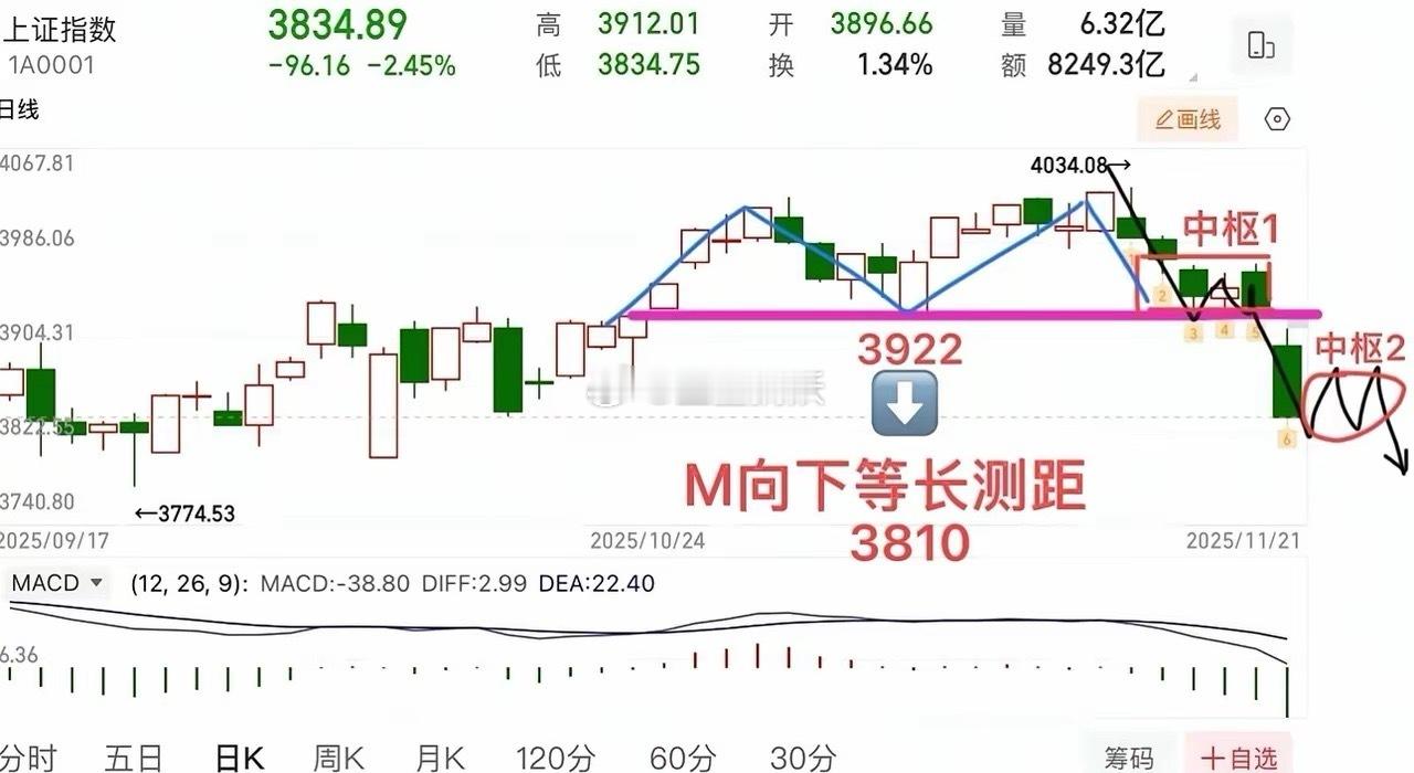 2025.11.23周日(下周策略):周初看超跌反弹!首先周末消息面来看,总体还是偏多的,美联储重提降息预期,外盘美股反弹,以及富时A50也是上涨的,那么对于周一开盘大概率情绪面会有一些积极的影响,当然了预期也不要太高,当作超跌反弹更合适。从技术面来看,上周五是一个跳空破位向下的走势结构,跌破3922颈线支撑,那么M头成立,会有向下等长的测距满足,往下翻一番,所以下一个目标点位先看3800附近。从结构上看,图2所示,以4034为下跌起点观察,空头力量明显还在放大,并没有衰竭的迹象,那么止跌的条件要先看到中枢,类似于第一个中枢,会有个多空拉锯的过程,只有当中枢出现,再踩一次刹车,才有可能真正形成止跌的条件。从4034开始的向下走势,完成两中枢再向下就容易发生背驰,才有可能完成从4034的下跌结构。下跌过程中,其实就是不断的踩刹车,直到空头力量衰竭,才有可能空转多。总结来说,下周初大概率构建第二个中枢,盘中会有多空拉锯的过程,在这个过程中个股会有修复,很多错杀的大概率还是会起来,完全破位的,弱修复还是要注意,尽量去弱留强。短线怎么看?明天大概率盘中会有反弹,即使再下探也容易出现探底回升(多空拉锯构建中枢的过程),注意量价之间的关系,缩量反弹一般压力都过不去,明日压力大阴线半分位以及3878和缺口。下周关键支撑3800,压力3878/缺口。个人观点,仅供参考!