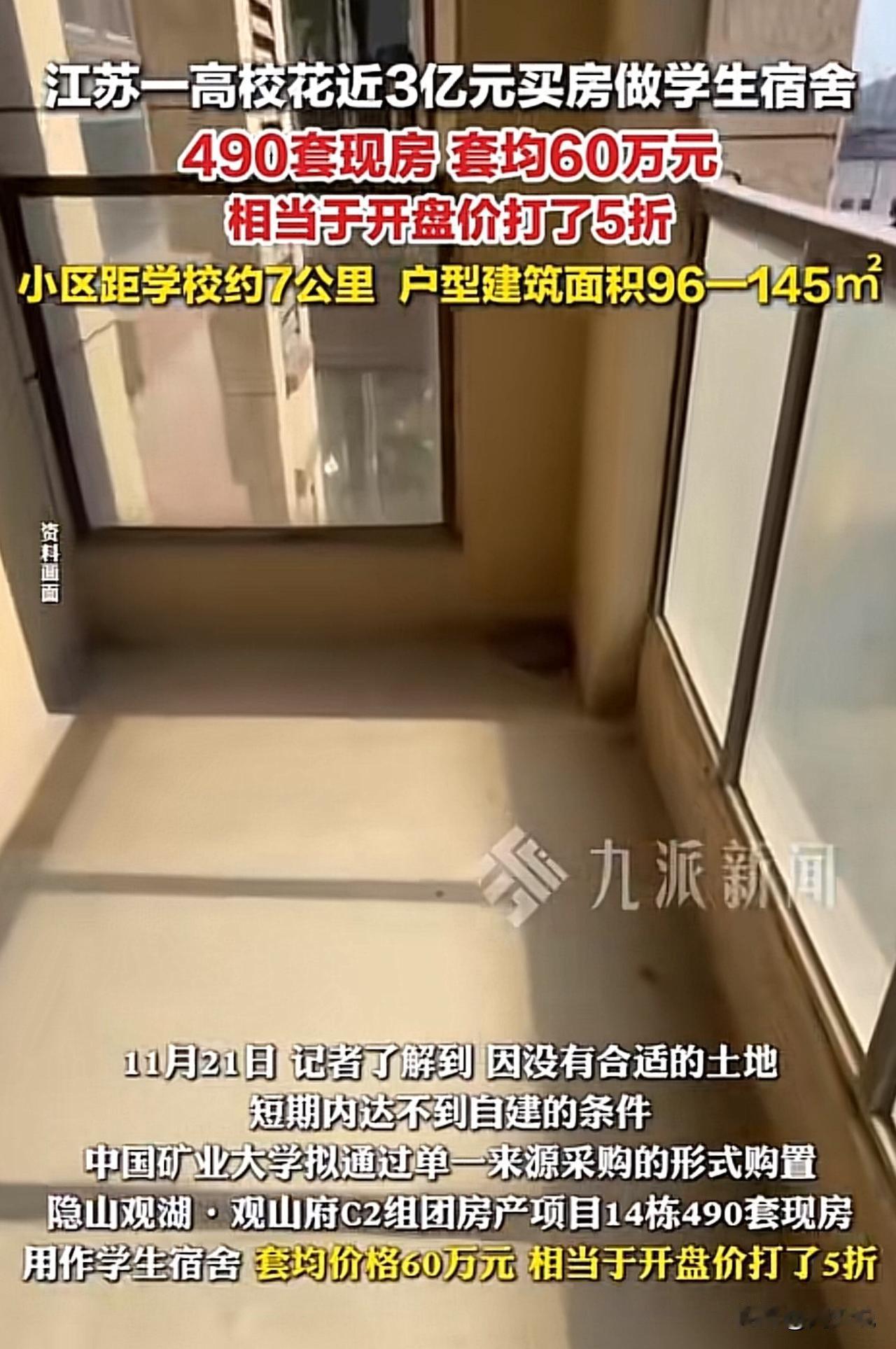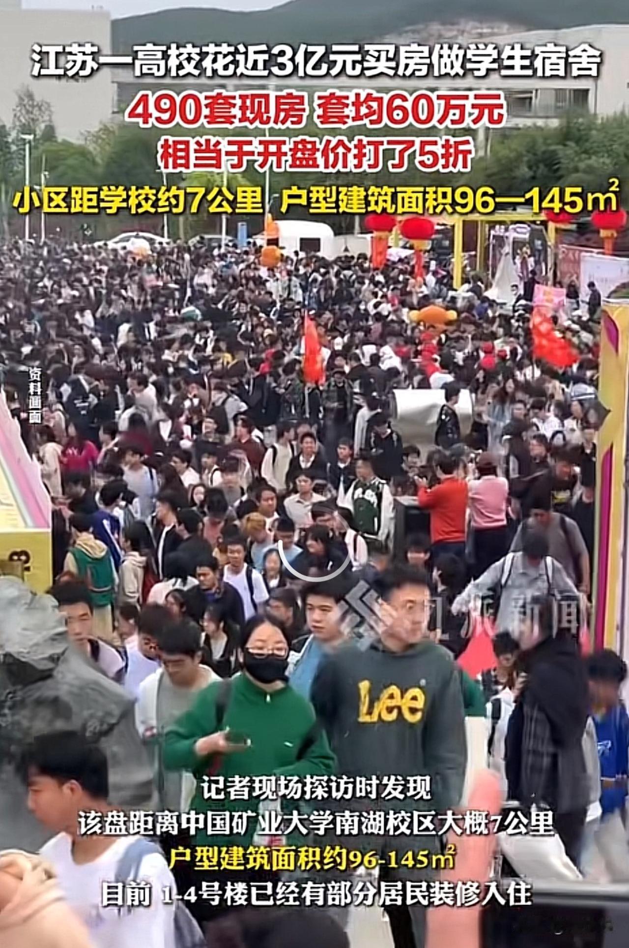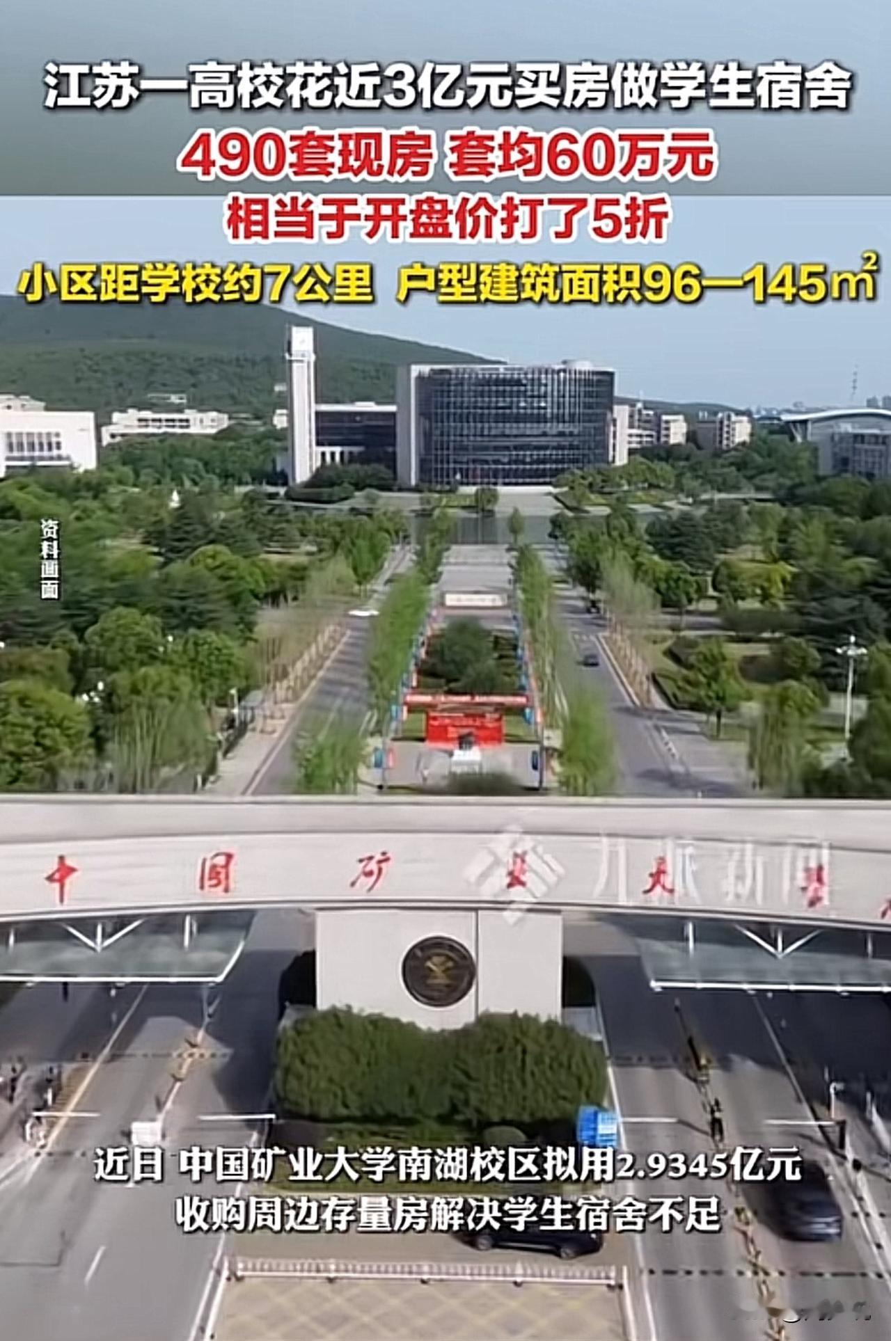 #高校花近3亿买商品房当宿舍#“狂砸2.9亿!中国矿业大学南湖校区的一则采购公示火了!”近日,中国矿业大学拟斥资2.9345亿元,收购周边490套现房改造成学生宿舍,60万的套均价比开盘价直接打了5折,引发全网热议。 众多网友纷纷点赞:“这才是把钱花在刀刃上,学生太幸福了!而且5折拿房还解决住宿难题,校方太会过日子了”! 看完这事,周少想说其实这不是孤例,中南大学、合肥工业大学等高校也已跟进类似模式。这波“以购代建”既破解了高校宿舍荒,又盘活了存量房产,是政策支持下的双赢之举。#寻美三湘# #长沙新朋友#