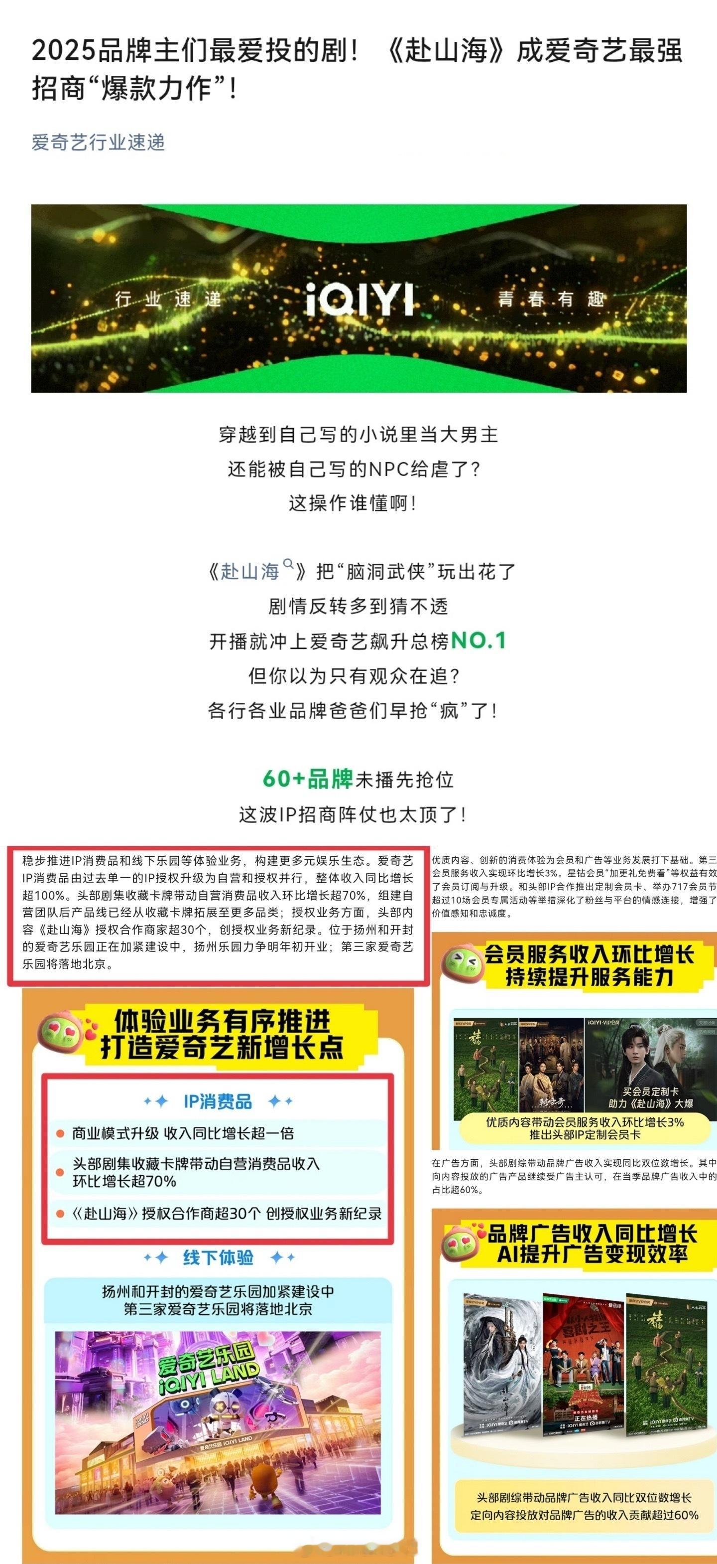 爱奇艺Q3财报来了!其中成毅《赴山海》授权合作商家超30个,创授权业务新纪录!成