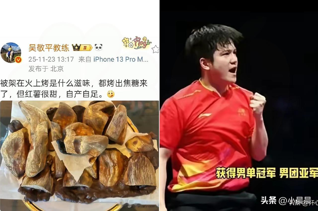 樊振东的教练又“搞事情”啦, 这次发文主角竟是红薯! 先感慨被架在火上烤的滋味,又夸红薯自产自足超甜,配图还是焦糖色的烤红薯,这操作太有深意。 网友们脑洞大开,说小胖就是那红薯,没被“烤糊”反而更甜,还有人解读“自产自足”,觉得小胖一年多没跟国家队高强度训练,靠自己打磨,全运会一亮相就成宗师级别,妥妥的T0级选手。 我超认同网友观点,吴教练哪能单纯说红薯呀,小胖就是他的心头宝,时不时为其鸣不平。 有这样挺自己的教练,小胖太幸运啦!在体育圈,教练和运动员相互成就,吴教练的这份支持,说不定就是小胖不断突破的动力。 大家觉得吴教练发文还有啥隐藏含义呢?