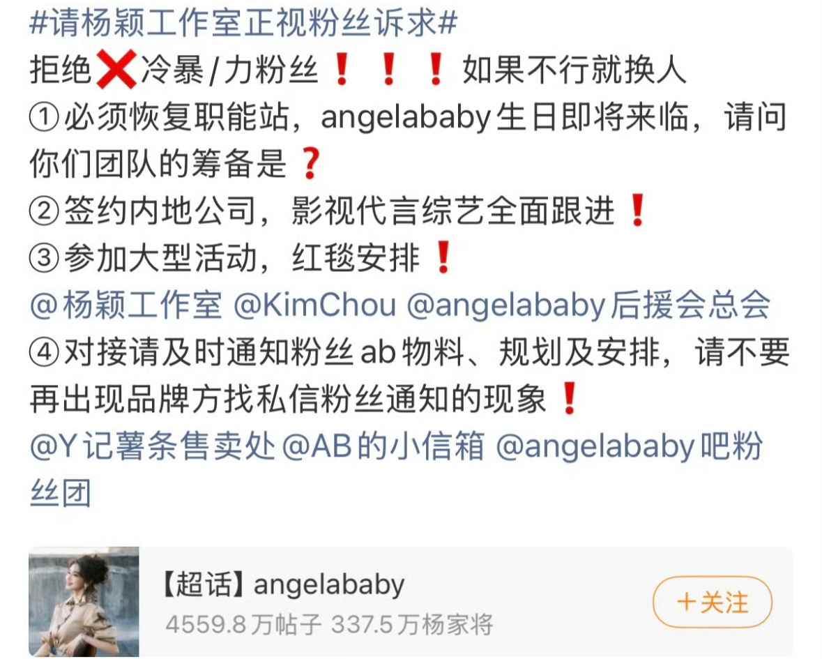 Angelababy粉丝向工作室提出诉求。鼻姐的人气和国民度确实很高,不要浪费了。工作室还是好好运营吧