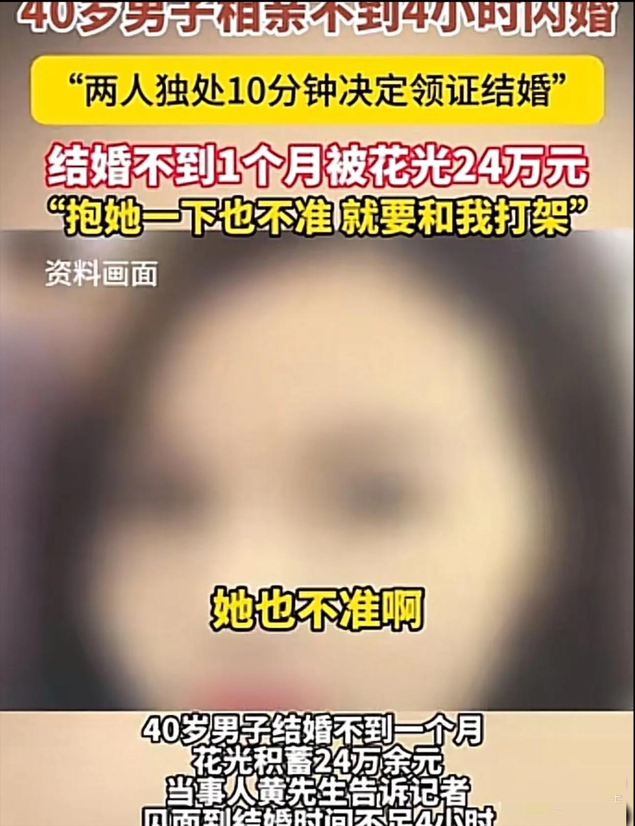 湖南衡阳,40岁男子以为遇到了真爱,和相亲认识不到4小时的女子领证结婚证。谁知,结婚2天后,妻子就让他去外地打工赚钱,男子想和妻子温存一下再走,可妻子连抱抱都不让。男子想着两情若是长久时,也不在朝朝暮暮,就答了。可他出去后,妻子没事不联系他,只要联系他,就张口闭口的要钱,才一个月的功夫,男子就转给妻子24万。眼看着男子被炸干了,妻子的狐狸尾巴终于露出来了。 这男的是个老实人,在镇上开了家小五金店,攒了点钱,就盼着找个伴过日子。相亲那天见着这女的,穿得干干净净,说话温柔,说自己也是真心想成家。他一时上头,觉得“缘分来了挡不住”,当天就拉着人去民政局扯了证,连女方家具体在哪都没问清楚。 出去打工的地方在工地上,他白天扛钢管,晚上睡工棚,省吃俭用就为了多攒点。妻子第一次要钱说“买家具”,他立马转了5万;没过几天又说“妈生病”,他咬咬牙找工友借了3万凑上;后来干脆说“想你了,给我打钱买机票来看你”,他愣是把准备扩大店面的16万都转了过去。 直到他手里一分钱都没了,连吃饭都得蹭工友的,妻子的电话就打不通了。他急得连夜请假赶回家,家里空荡荡的,当初带来的行李箱不见了,衣柜里属于她的衣服也没了影。邻居见了他才说:“你媳妇前几天就走了,跟一个男的一起,拎着好几个大包呢。” 他这才傻了眼,去派出所报案,查了才知道,这女的根本不是真心跟他过日子,就是冲着他的钱来的。之前已经用同样的法子骗了俩男的,拿到钱就消失。他拿着结婚证蹲在民政局门口哭,认识4小时就结婚,这哪是真爱,分明是给自己挖了个坑。 过日子哪能这么心急?婚姻不是买彩票,光靠一时冲动可不行。连对方底细都没摸清就领证,说白了就是对自己不负责。这女的固然可恨,可他自己也太糊涂,把“结婚”当儿戏,最后只能吞下这苦果。 各位读者你们怎么看?欢迎在评论区讨论。