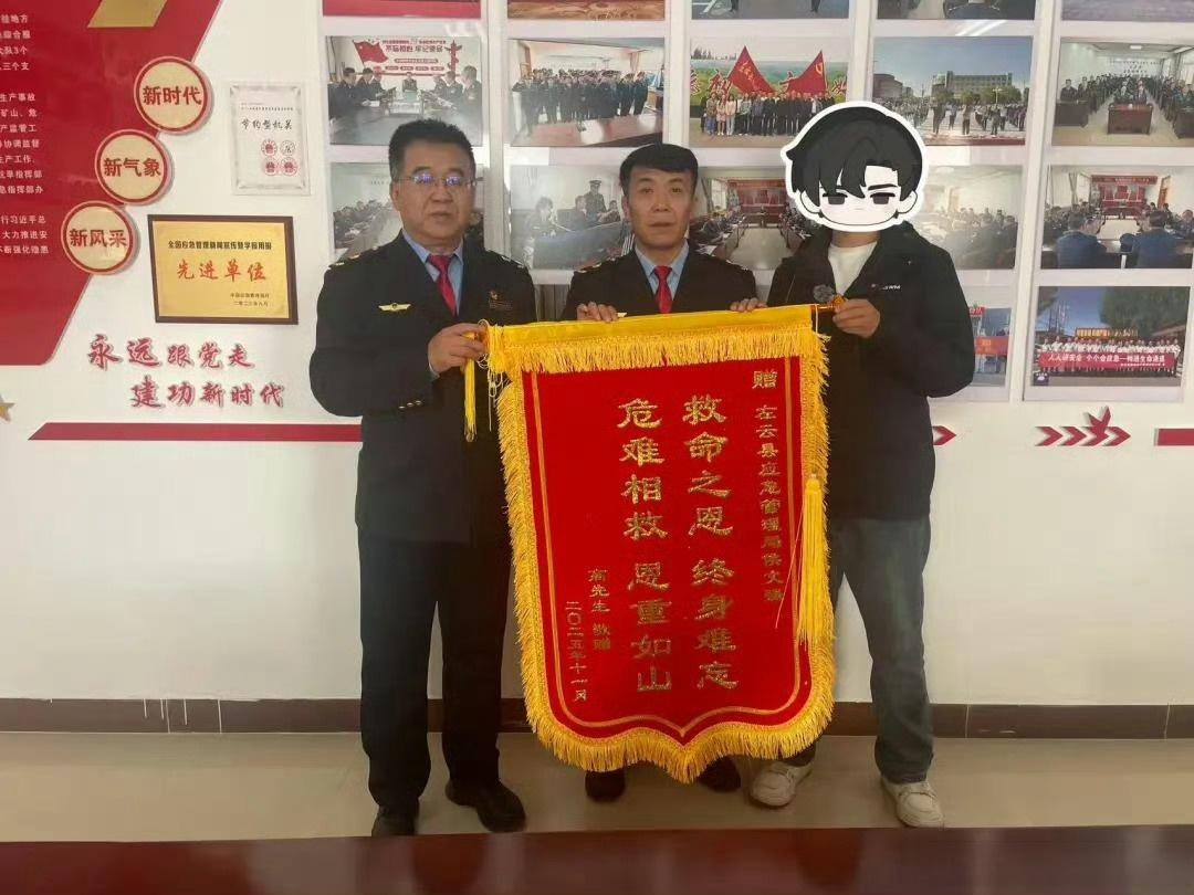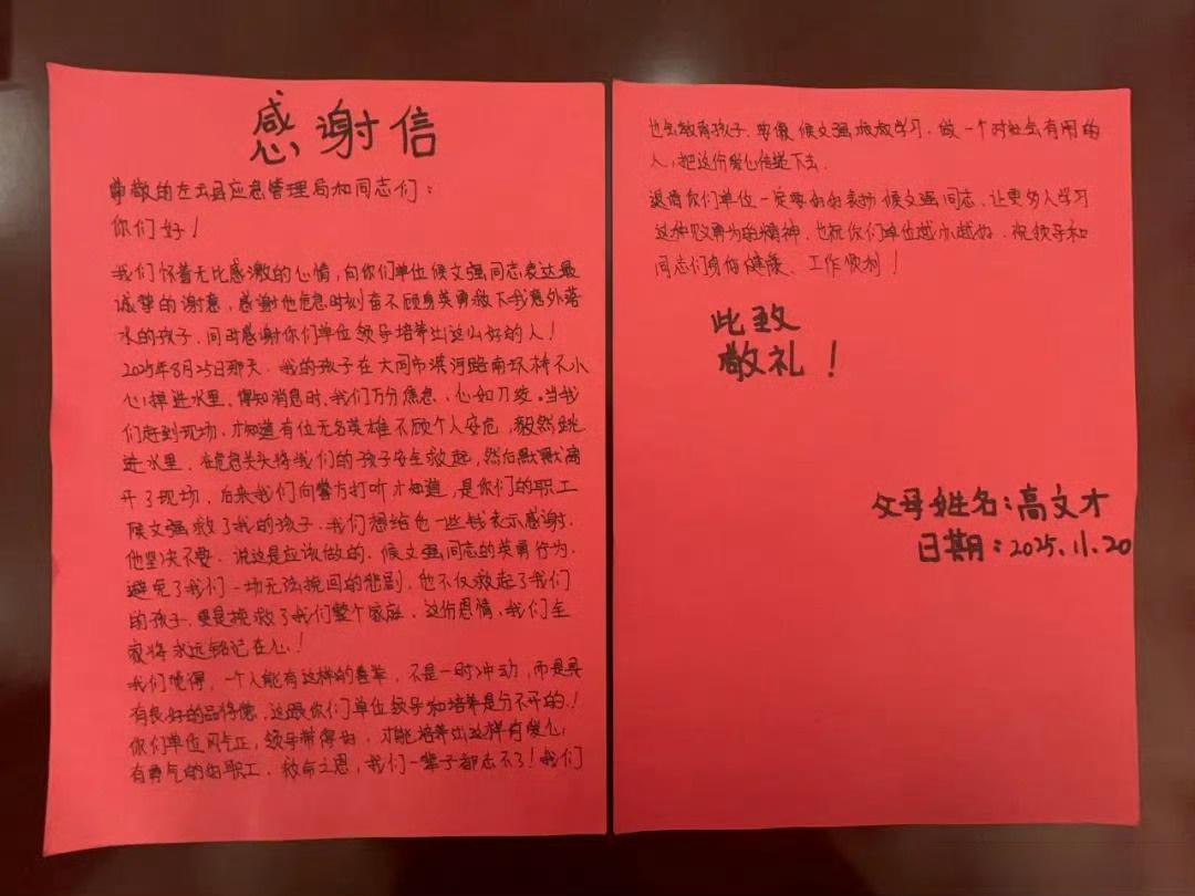 【大同退役军人勇救落水女孩 】晋善晋美日前,一女孩在御河南环桥段不慎落水,危急时刻,路过此地的左云县应急管理局职工、退役军人侯文强挺身而出,跳入水中救起孩子,抵达岸边后,近2米高的河坝挡住了去路,侯文强对女孩说:“你踩着叔叔的肩膀,我把你顶上去!”在岸上群众的协助下,女孩成功得救。上岸后确认女孩无恙,侯文强便默默离开。近日,女孩的家人辗转找到侯文强,送去一面锦旗和一封感谢信。 侯文强说,尽管已30多年未曾游过泳,但军人的信念让其毅然决定下水。