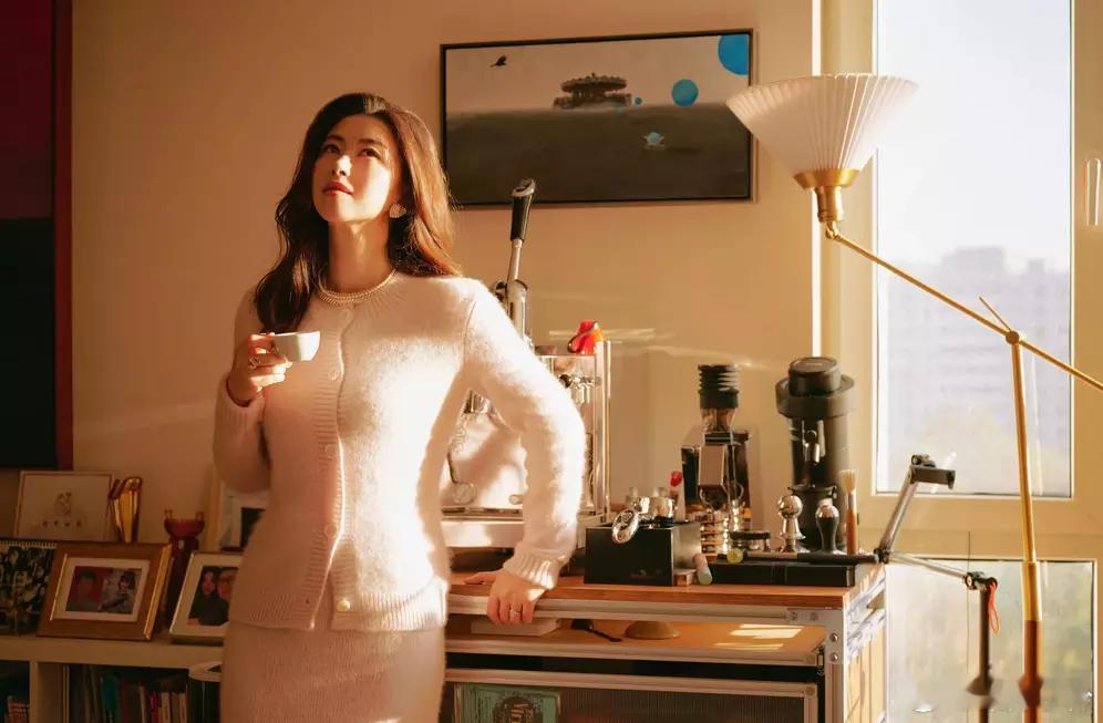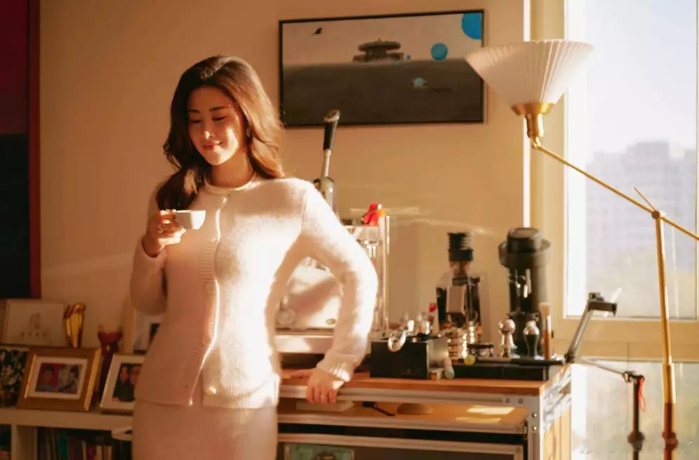 朱珠妆容精致,身着粉色针织开衫,佩戴珍珠项链与戒指,在暖光下涂口红,尽显优雅知性。