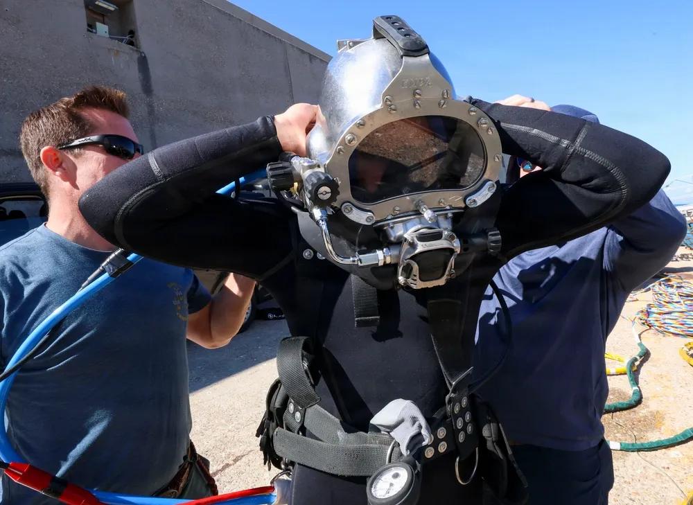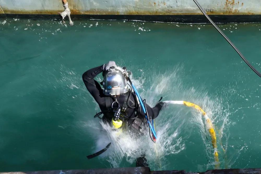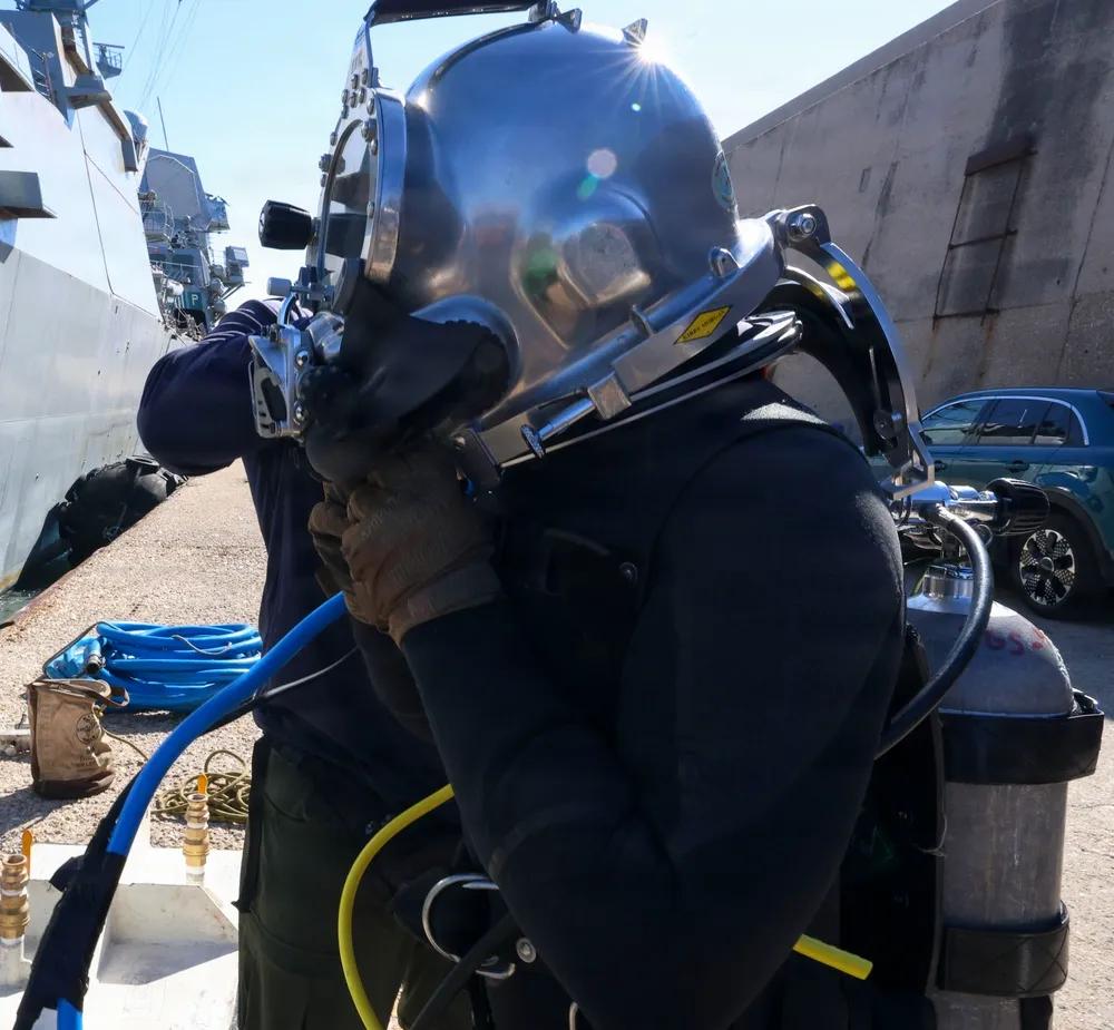 2025年10月18日,隶属于美军前沿部署区域维修中心的海军二等潜水员拉塞尔·布罗迪(Russell Brody)身穿深潜的潜水装备,对伯克级导弹驱逐舰“贝恩布里奇”号(USS Bainbridge,DDG 96)在意大利奇维塔韦基亚进行中期部署航行维修期间进行水下维护。“贝恩布里奇”号作为航母打击群12的一部分,正在美国第六舰队作战区内执行计划部署任务,以支持美军欧洲-非洲海军力量的作战效能、杀伤力和战备能力,并保卫美国、盟军及合作伙伴在该地区的利益。