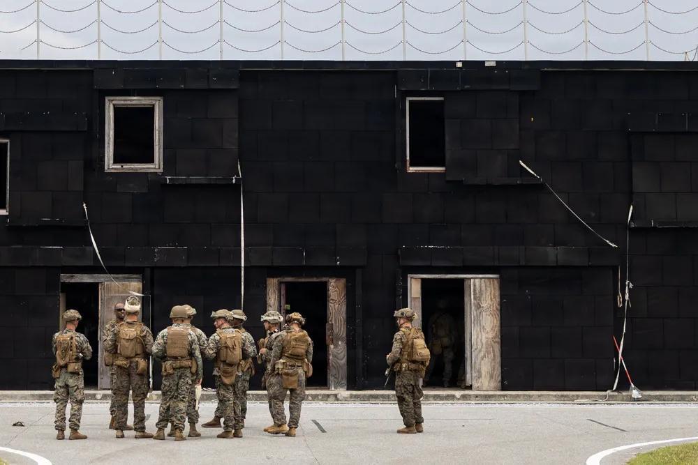 2025年10月28日,美军第3海军师第12海岸战斗大队第12海军陆战团的步枪手,在日本冲绳汉森营地进行城市地形训练时进入一栋建筑物。海军陆战队员在170系列射击训练中进行了爆破、近战格斗和压力射击演练,以提升个人技能并增强在高压环境下的表现。