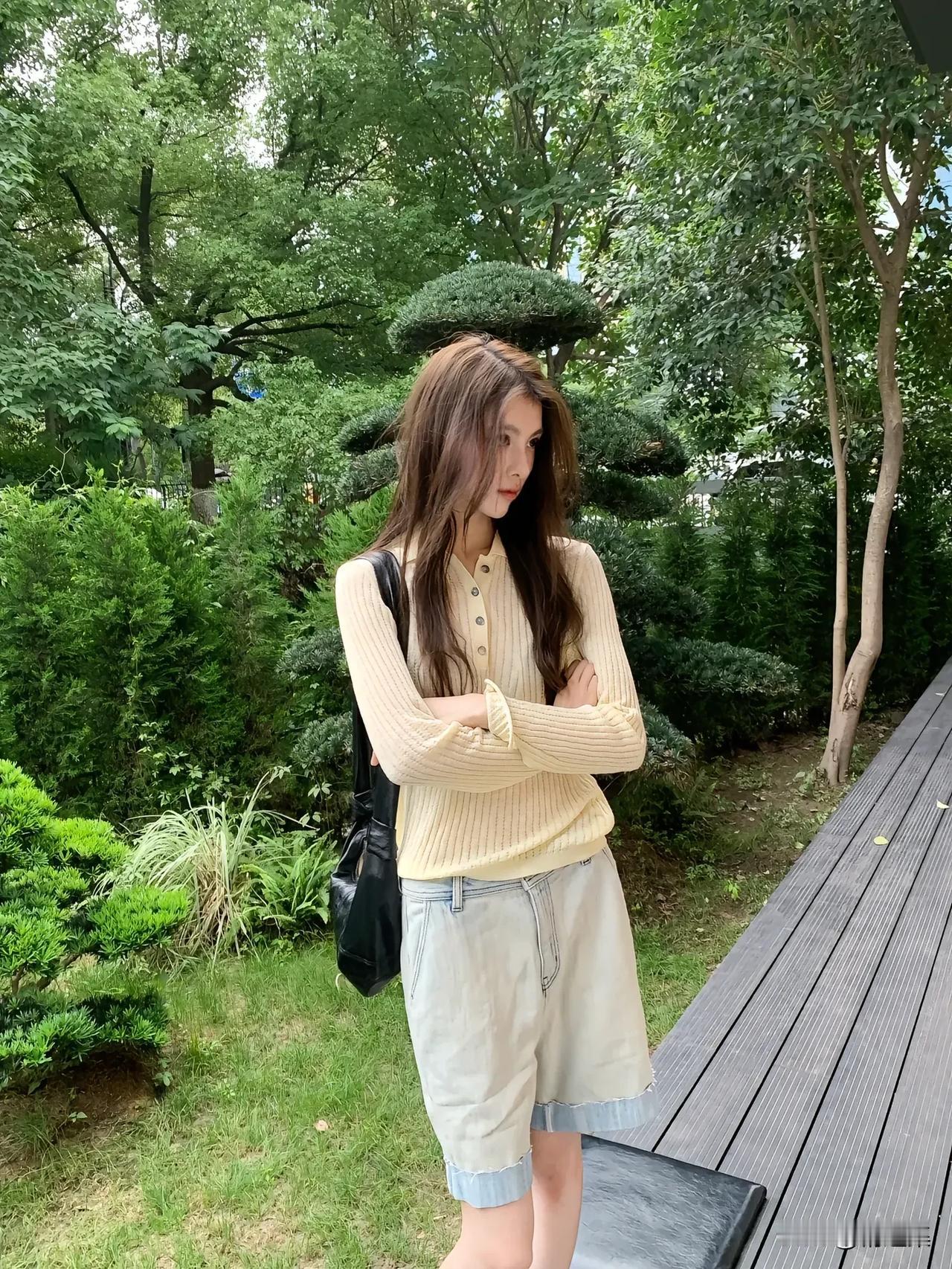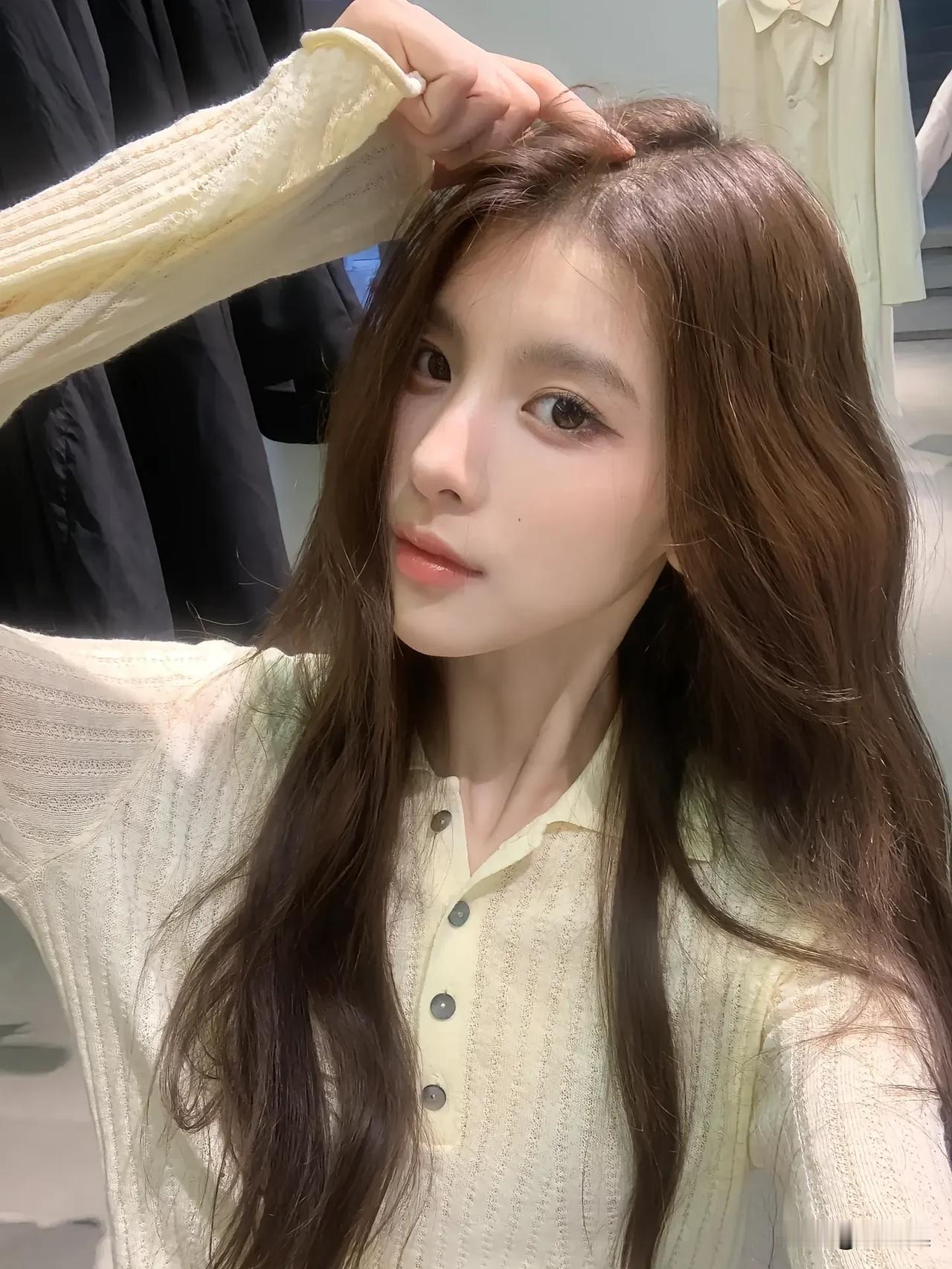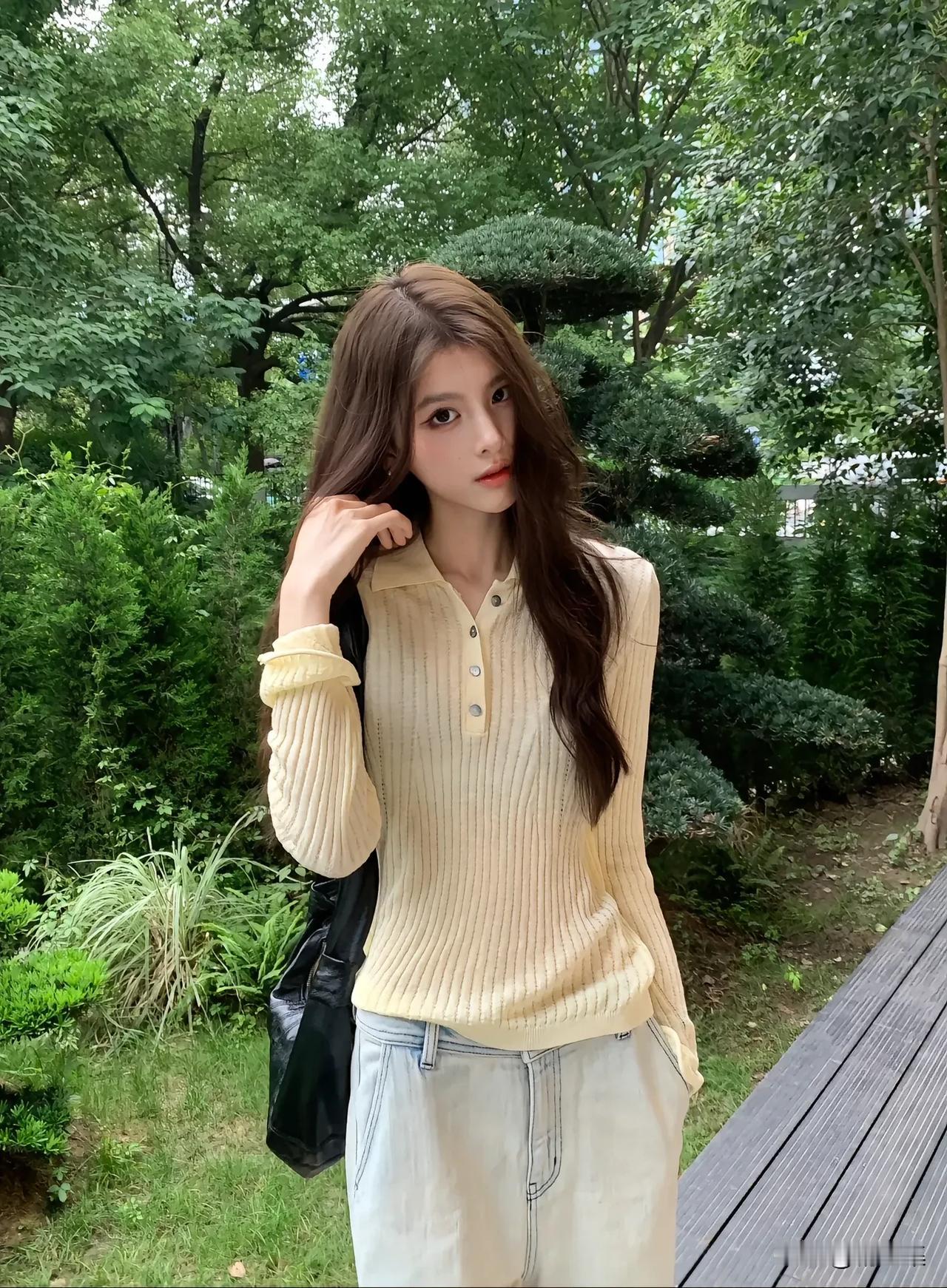 温柔日系穿搭,浅黄色针织衫搭配长卷发,清新自然。