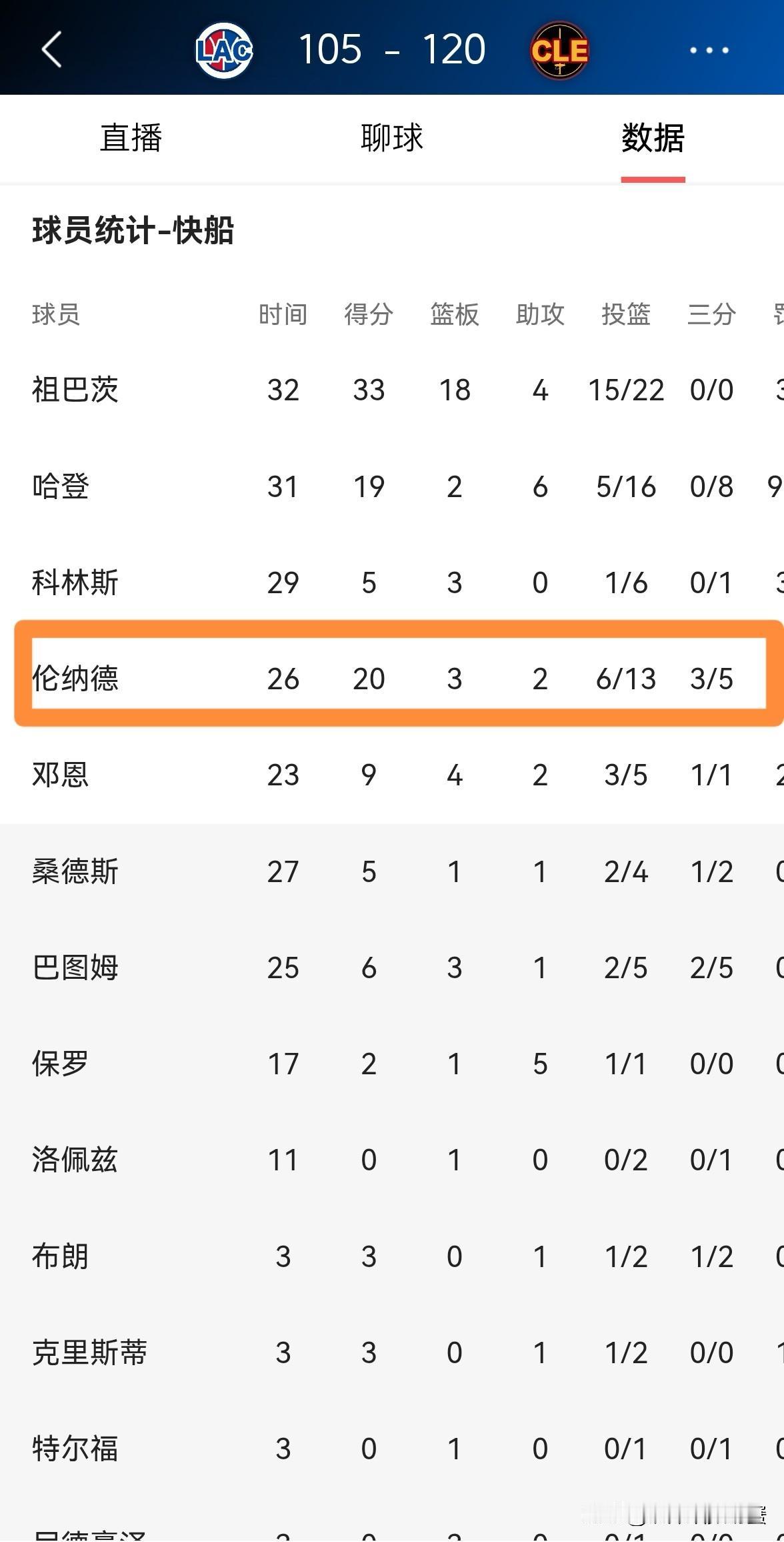 快船当家球星伦纳德真是攻防俱佳!在今天快船客场以105:120不敌骑士的比赛中,