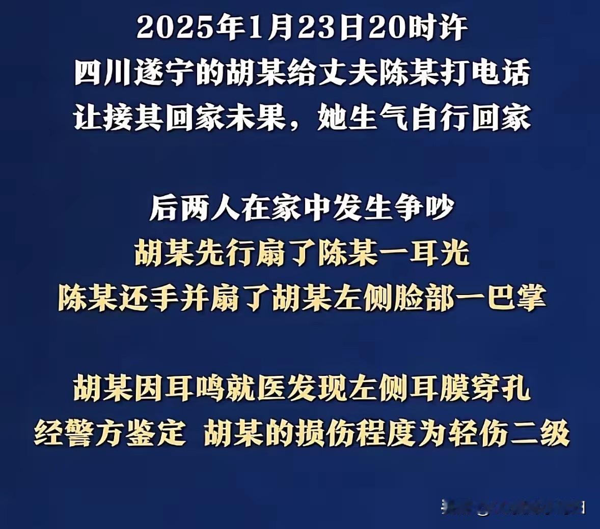 “打不还手骂不还口?”四川遂宁,女子打电话让丈夫接她下班,可丈夫却没去接,女子怒气冲冲的自己打车回家。回家后她质问丈夫为啥不去接自己,丈夫觉得自己来回折腾的油费都够她打车回来了,何必要折腾这一趟。女子觉得丈夫就是不关心自己,两人各有各的说法,越吵越烈。 气急的女子扬手给了丈夫一巴掌,打完之后她就有点后悔了,刚想服软。没想到,同样生气的丈夫反手就啪的还了她一巴掌,力道之大,当时她的脸就火辣辣的疼,耳朵里嗡嗡直响。 第二天女子去医院检查,她的耳膜竟然穿孔,经鉴定为轻伤二级。 女子咽不下这口气,把丈夫告了,检察院认为应该以故意伤害罪追究丈夫的刑事责任,可丈夫一方认为这是正当防卫,是女子先动手他才还手的,顶多算防卫过当。 但法院认为女子当时打完一巴掌没有继续打第二巴掌的意思,伤害已经结束,所以丈夫并非是为了制止正在进行的不打伤害,主观上不具有防卫意图,不属于防卫行为,最终丈夫以故意伤害被判处拘役6个月! 看到这个结果网友炸锅了,感觉不可思议! 有网友说:这是家庭矛盾,双方互殴,况且是女方先出手打人,男方觉得不能接受,顺手打了女方,男人的力量要大点,双方正在怒火时,互殴时男方未能掌握轻重,这种是失手打人,也可以说是自卫。怎么全部归咎于男方的错,应是女方有错在先。这种判刑不合法。 也有网友说:女方这一耳光,过程虽己经完成,但精神和心理伤害在持续扩大状态,因此回击应属正当防卫,回击本身就是被动出手,不存在主观故意伤害。如按法官判案逻辑,必须对方耳光打过来还没落脸上时,你出手才算正当防卫?那么请问法官那怎么认定互殴的呢?? 还有网友说:这事处理有点不合情,这是家庭矛盾,如果能调节就和和气气的道个歉了事了,这男的一坐牢,六个月以后出来这日子还能过下去吗?这女的还能在这家里待的下去吗?孩子以后会怎么看待这事,一辈子心里产生了阴影! 更有网友说:若对方刺 了你一刀,你反手一拳打过去,把对方打成二级轻伤,是不是也应该判被 刺一方输,因为对方已经刺完了,你再还手,就属于故意 伤害,我有点晕! 本来就是一个家庭纠纷没想到最后却成了这样,可以说这个家也就散了!本来就是女子有错在先,自己打车回家就好了,为啥非要接送。而且还是她先动手的,丈夫才还手,只是生气的人可能没控制住力道,才造成这样严重的后果。 一般情况下就是女子去医院治疗,估计女子也不想过了所以才会把丈夫告了,不知道这个结果她是不是满意! 但这个结果确实让人很难接受,尤其是判处的理由。被打还手为啥不能算正当防卫?难道就因为她不打了,就不能还手,白白挨打?那正当防卫存在的意义是什么? 对此你怎么看?